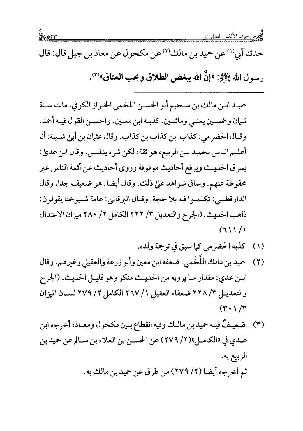 حدثنا أبي (¬١) عن حميد بن مالك (¬٢) عن مكحول عن معاذ بن جبل قال: قال رسول الله - صلى الله عليه وسلم -: "إنَّ الله يبغض الطلاق ويحب العتاق" (¬٣).
