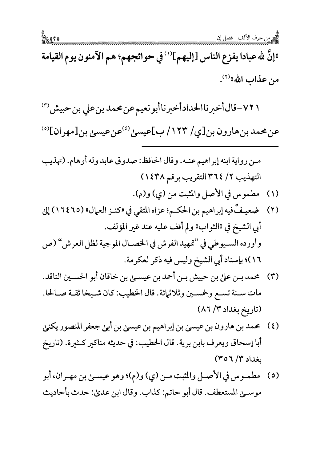 ٧٢١ - قال أخبرنا الحداد أخبرنا أبو نعيم عن محمد بن علي بن حبيش (¬٣) عن محمد بن هارون بن عيسى (¬٤) عن عيسى بن [مهران] (¬٥)