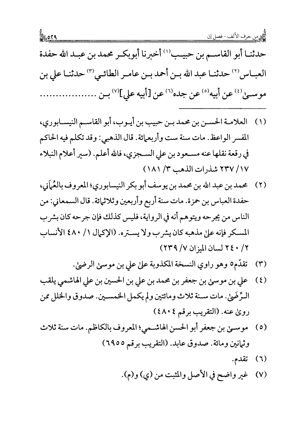 (¬١) العلامة الحسن بن محمد بن حبيب بن أيوب، أبو القاسم النيسابوري، المفسر الواعظ. مات سنة ست وأربعمائة. قال الذهبي: وقد تكلم فيه الحاكم في رقعة نقلها عنه مسعود بن علي السجزي، فالله أعلم. (سير أعلام النبلاء ١٧/ ٢٣٧ شذرات الذهب ٣/ ١٨١)