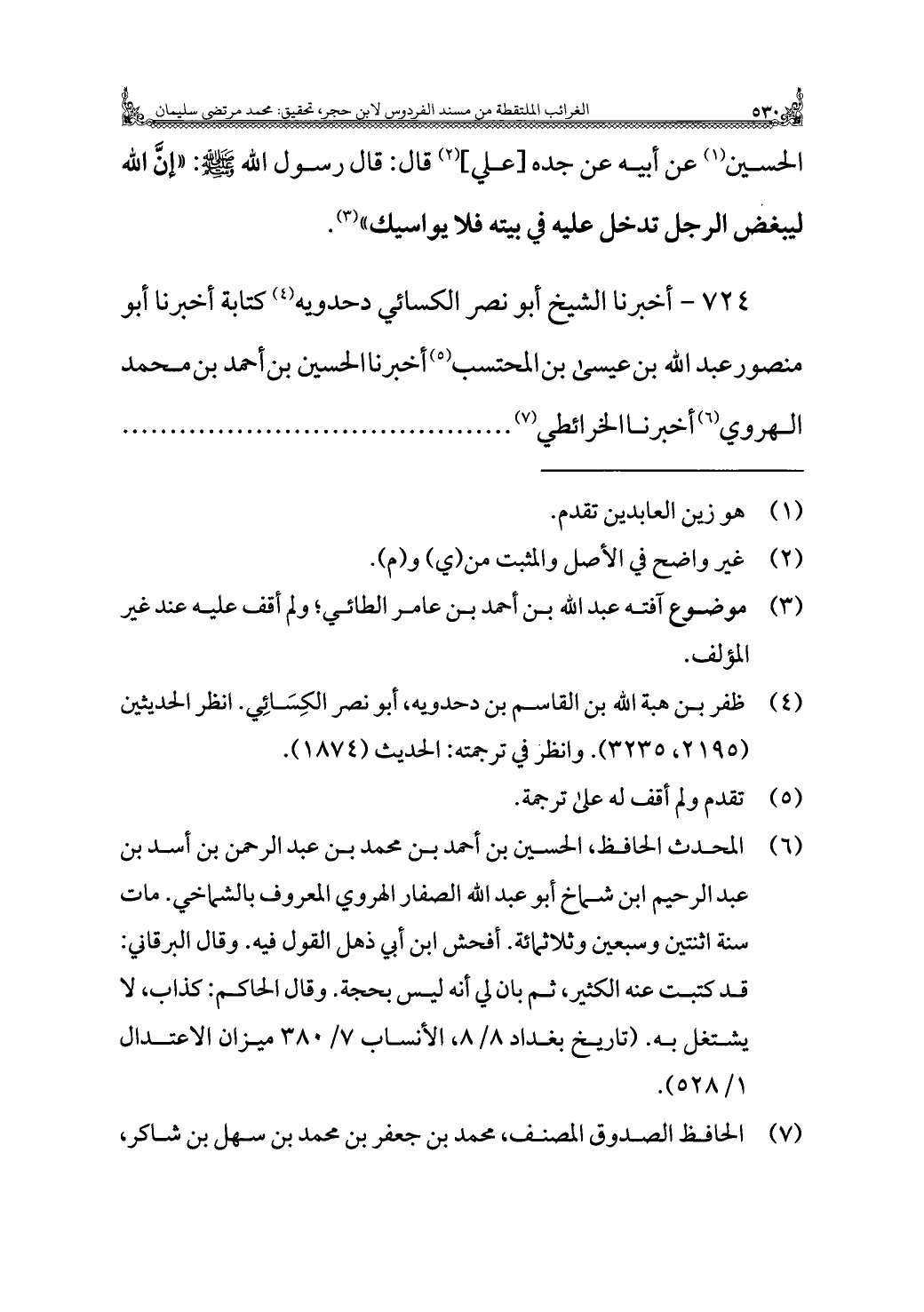 ٧٢٤ - أخبرنا الشيخ أبو نصر الكسائي دحدويه (¬٤) كتابة أخبرنا أبو منصور عبد الله بن عيسى بن المحتسب (¬٥) أخبرنا الحسين بن أحمد بن محمد الهروي (¬٦) أخبرنا الخرائطي (¬٧)