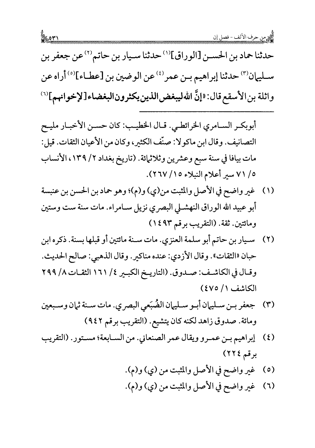 حدثنا حماد بن الحسن [الوراق] (¬١) حدثنا سيار بن حاتم (¬٢) عن جعفر بن سليمان (¬٣) حدثنا إبراهيم بن عمر (¬٤) عن الوضين بن [عطاء] (¬٥) أراه عن واثلة بن الأسقع قال: "إنَّ الله ليبغض الذين يكثرون البغضاء [لإخوانهم] (¬٦)