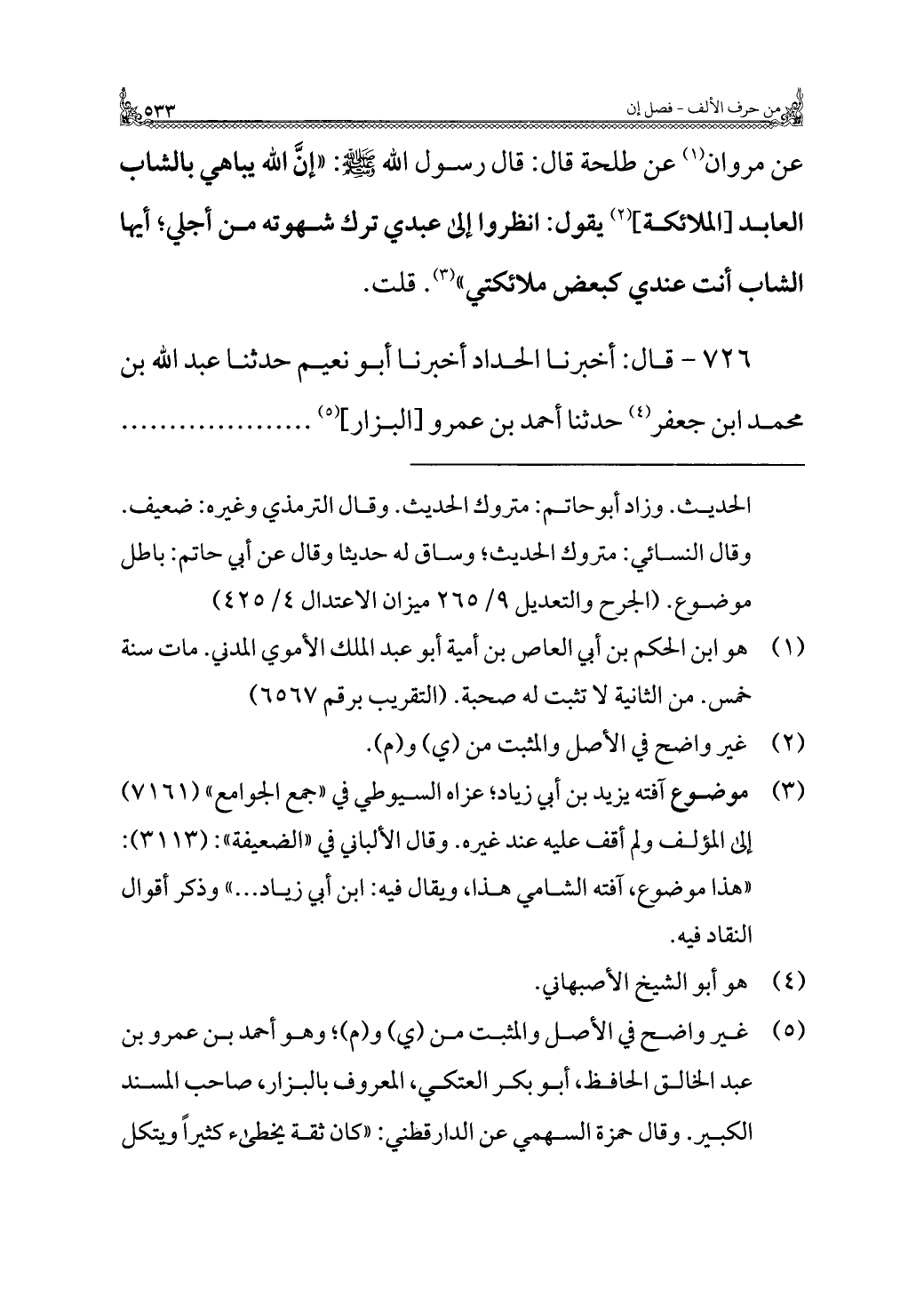 عن مروان (¬١) عن طلحة قال: قال رسول الله - صلى الله عليه وسلم -: "إنَّ الله يباهي بالشاب العابد [الملائكة] (¬٢) يقول: انظروا إلى عبدي ترك شهوته من أجلي؛ أيها الشاب أنت عندي كبعض ملائكتي" (¬٣). قلت.
