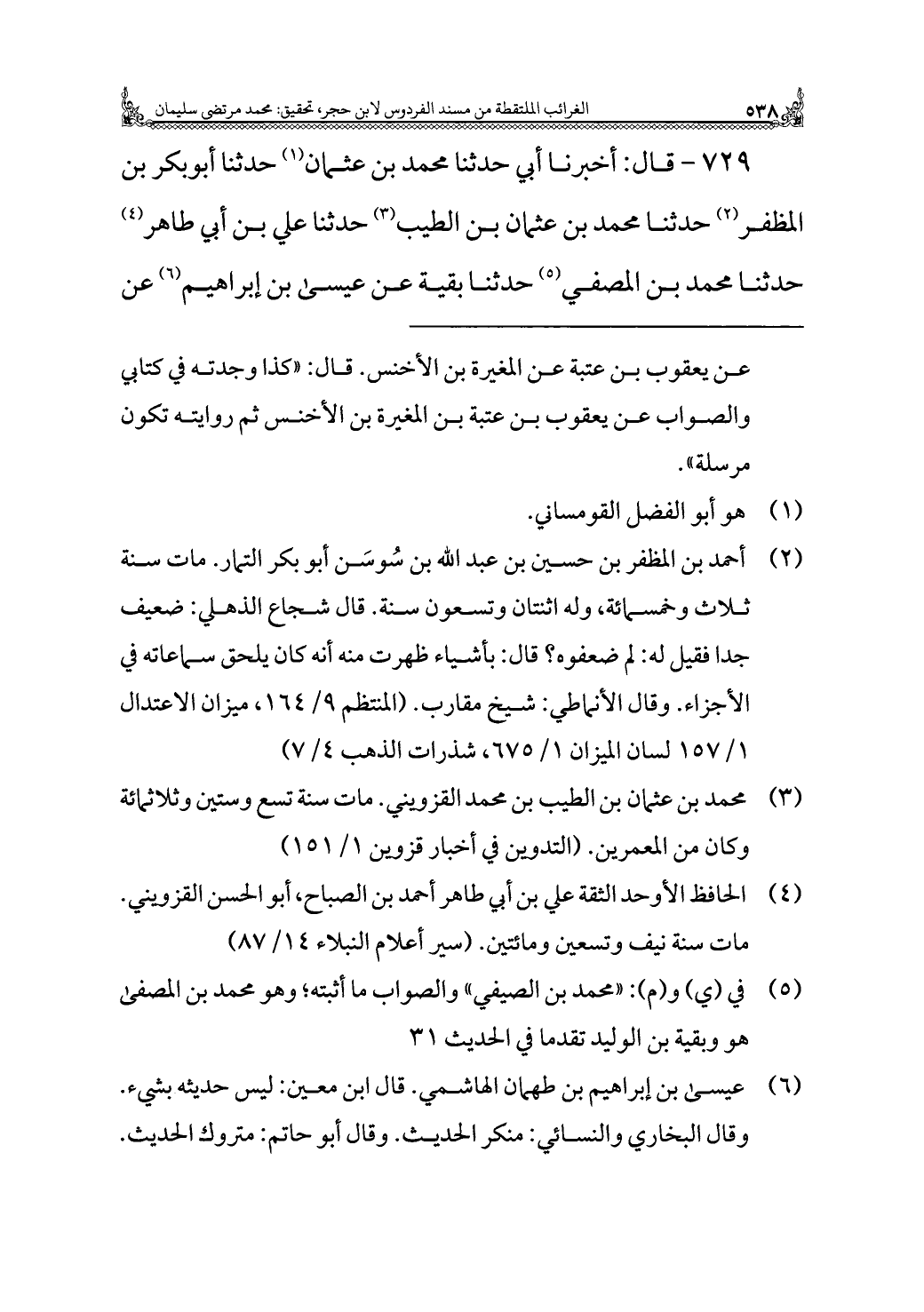 ٧٢٩ - قال: أخبرنا أبي حدثنا محمد بن عثمان (¬١) حدثنا أبو بكر بن المظفر (¬٢) حدثنا محمد بن عثمان بن الطيب (¬٣) حدثنا علي بن أبي طاهر (¬٤) حدثنا محمد بن المصفي (¬٥) حدثنا بقية عن عيسى بن إبراهيم (¬٦) عن
