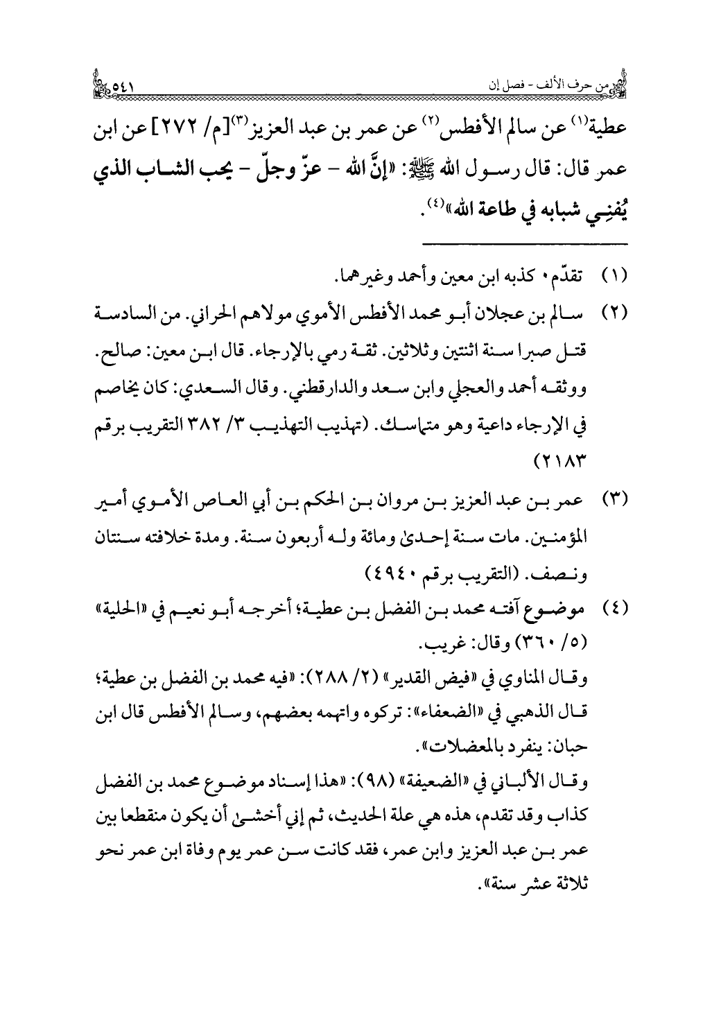 عطية (¬١) عن سالم الأفطس (¬٢) عن عمر بن عبد العزيز (¬٣) عن ابن عمر قال: قال رسول الله - صلى الله عليه وسلم -: "إنَّ الله - عزّ وجلّ - يحب الشاب الذي يُفنِي شبابه في طاعة الله" (¬٤).