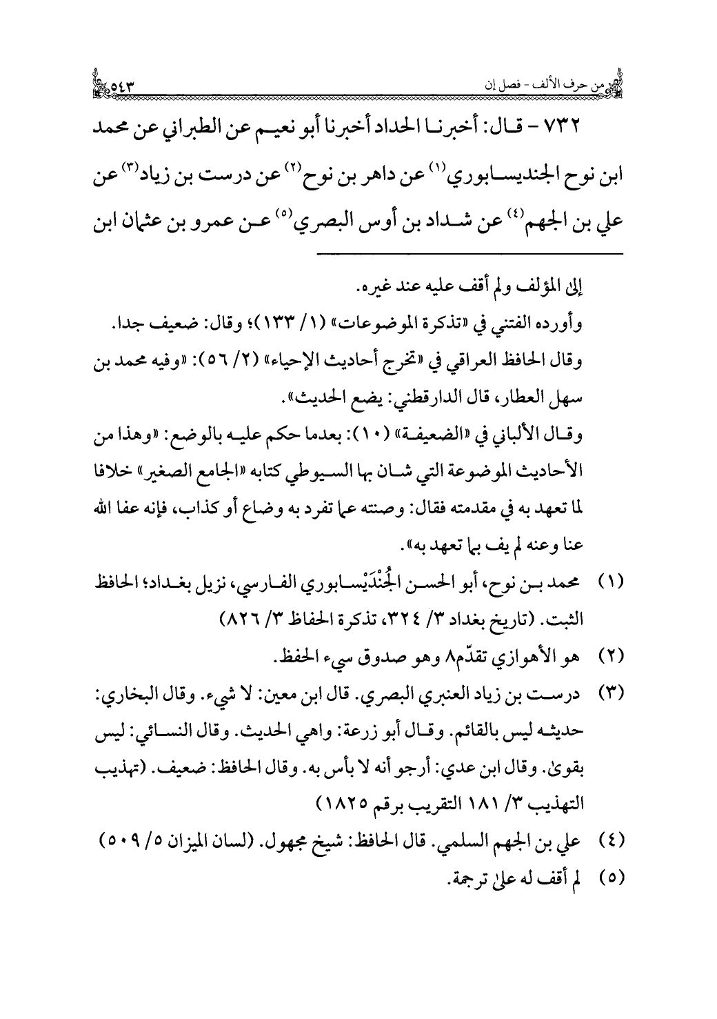٧٣٢ - قال: أخبرنا الحداد أخبرنا أبو نعيم عن الطبراني عن محمد بن نوح الجنديسابوري (¬١) عن داهر بن نوح (¬٢) عن درست بن زياد (¬٣) عن علي بن الجهم (¬٤) عن شداد بن أوس البصري (¬٥) عن عمرو بن عثمان ابن