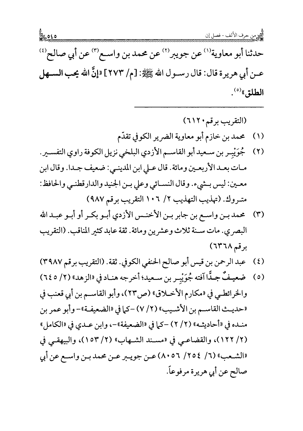 حدثنا أبو معاوية (¬١) عن جويبر (¬٢) عن محمد بن واسع (¬٣) عن أبي صالح (¬٤) عن أبي هريرة قال: قال رسول الله - صلى الله عليه وسلم -: "إنَّ الله يحب السهل الطلق" (¬٥).