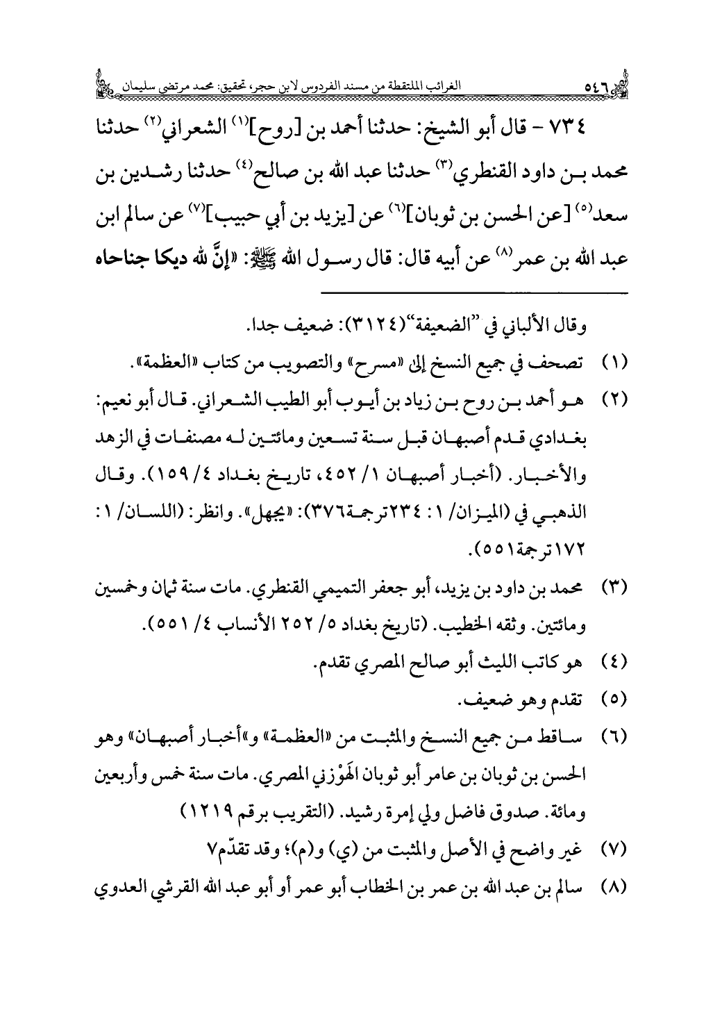 ٧٣٤ - قال أبو الشيخ: حدثنا أحمد بن [روح] (¬١) الشعراني (¬٢) حدثنا محمد بن داود القنطري (¬٣) حدثنا عبد الله بن صالح (¬٤) حدثنا رشدين بن سعد (¬٥) [عن الحسن بن ثوبان] (¬٦) عن [يزيد بن أبي حبيب] (¬٧) عن سالم بن عبد الله بن عمر (¬٨) عن أبيه قال: قال رسول الله - صلى الله عليه وسلم -: "إنَّ لله ديكا جناحاه