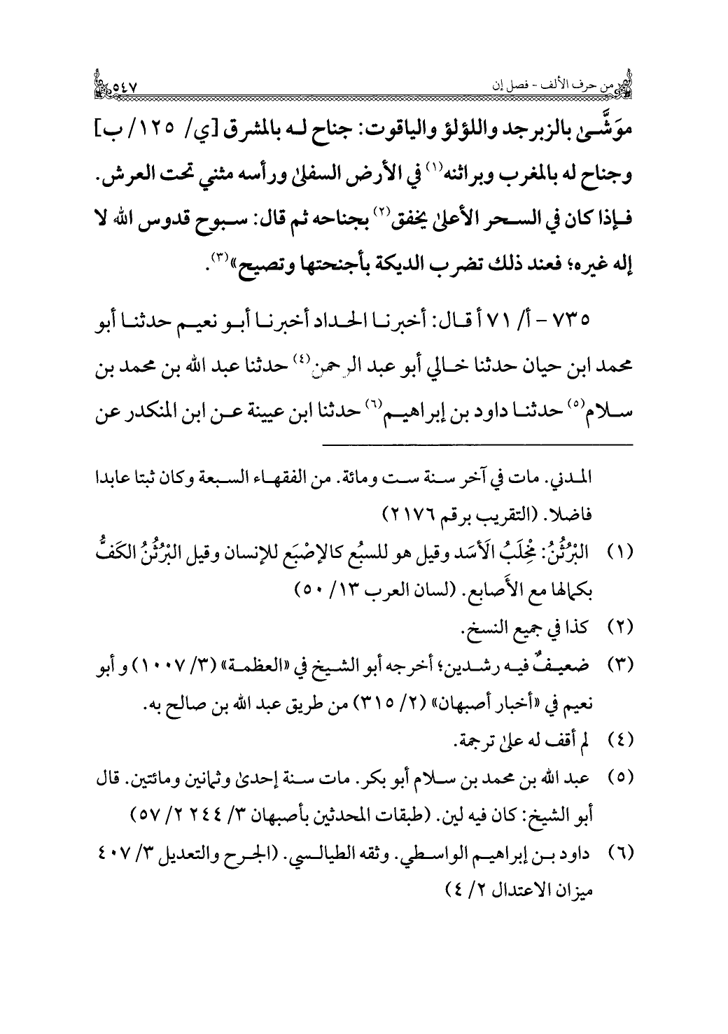 ٧٣٥ - قال: أخبرنا الحداد أخبرنا أبو نعيم حدثنا أبو محمد بن حيان حدثنا خالي أبو عبد الرحمن (¬٤) حدثنا عبد الله بن محمد بن سلام (¬٥) حدثنا داود بن إبراهيم (¬٦) حدثنا ابن عيينة عن ابن المنكدر عن