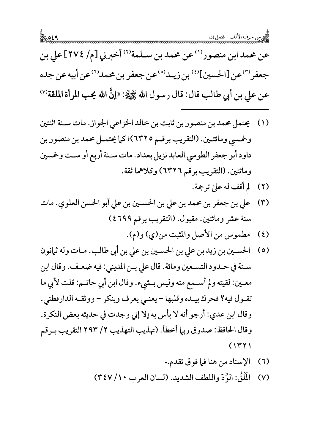 عن محمد بن منصور (¬١) عن محمد بن سلمة (¬٢) أخبرني علي بن جعفر (¬٣) عن [الحسين] (¬٤) بن زيد (¬٥) عن جعفر بن محمد (¬٦) عن أبيه عن جده عن علي بن أبي طالب قال: قال رسول الله - صلى الله عليه وسلم -: "إنَّ الله يحب المرأة الملقة (¬٧)