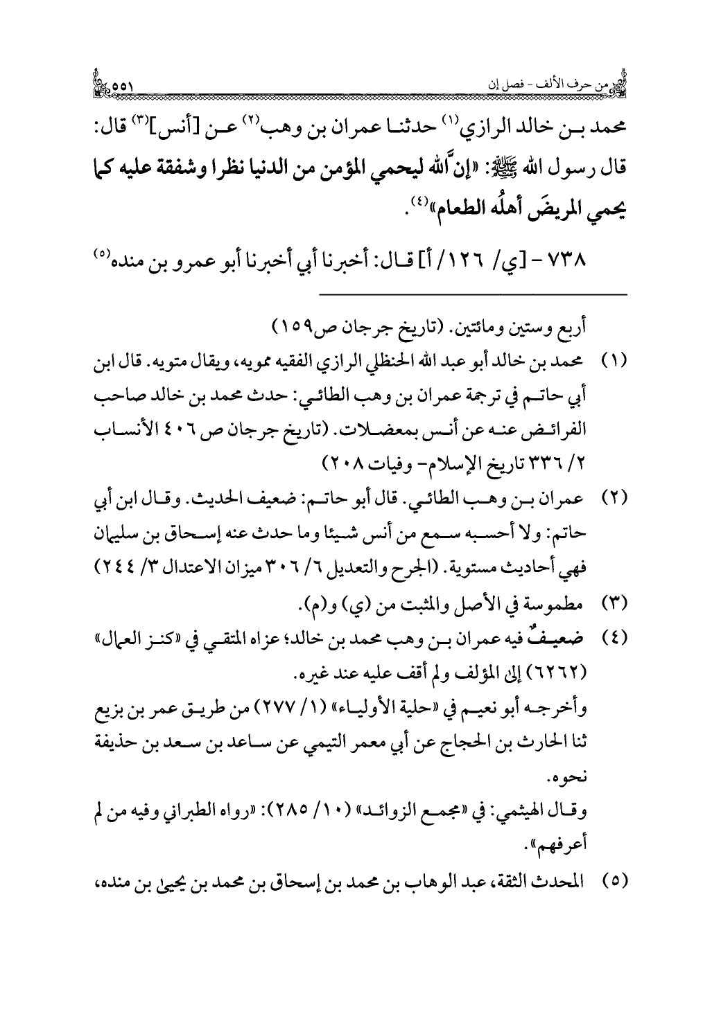 محمد بن خالد الرازي (¬١) حدثنا عمران بن وهب (¬٢) عن [أنس] (¬٣) قال: قال رسول الله - صلى الله عليه وسلم -: "إنَّ الله ليحمي المؤمن من الدنيا نظرا وشفقة عليه كما يحمي المريضَ أهلُه الطعام" (¬٤).