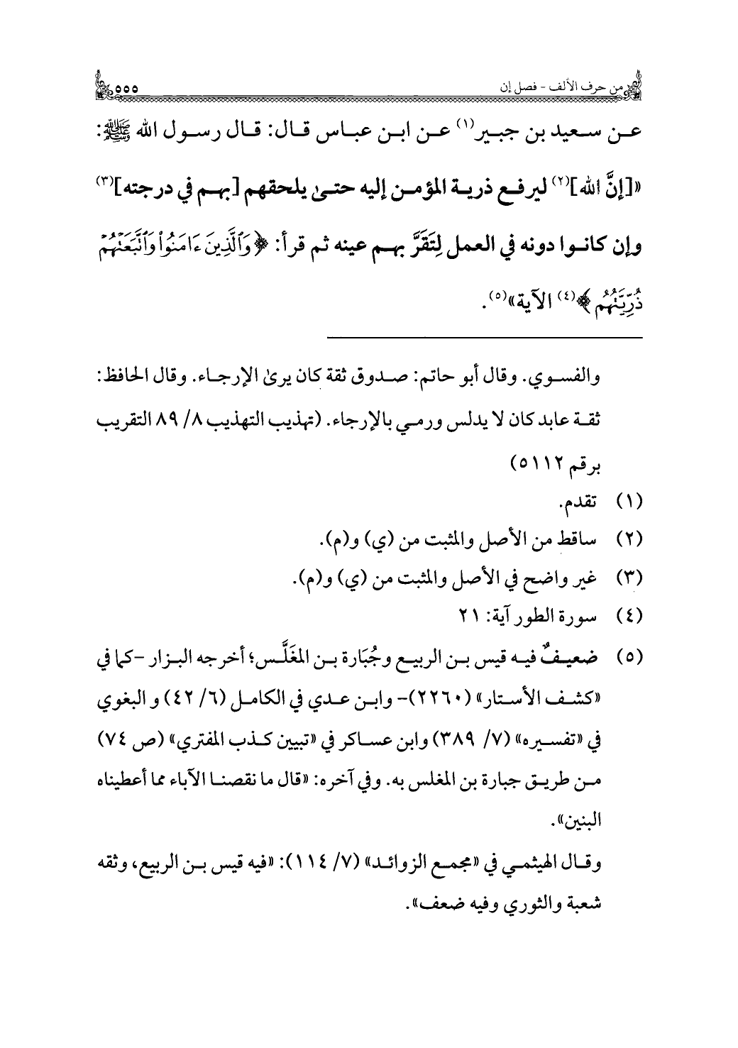 عن سعيد بن جبير (¬١) عن ابن عباس قال: قال رسول الله - صلى الله عليه وسلم -: " [إنَّ الله] (¬٢) ليرفع ذرية المؤمن إليه حتى يلحقهم [بهم في درجته] (¬٣) وإن كانوا دونه في العمل لِتَقَرَّ بهم عينه ثم قرأ: {وَالَّذِينَ آمَنُوا وَاتَّبَعَتْهُمْ ذُرِّيَّتُهُمْ} (¬٤) الآية" (¬٥).
