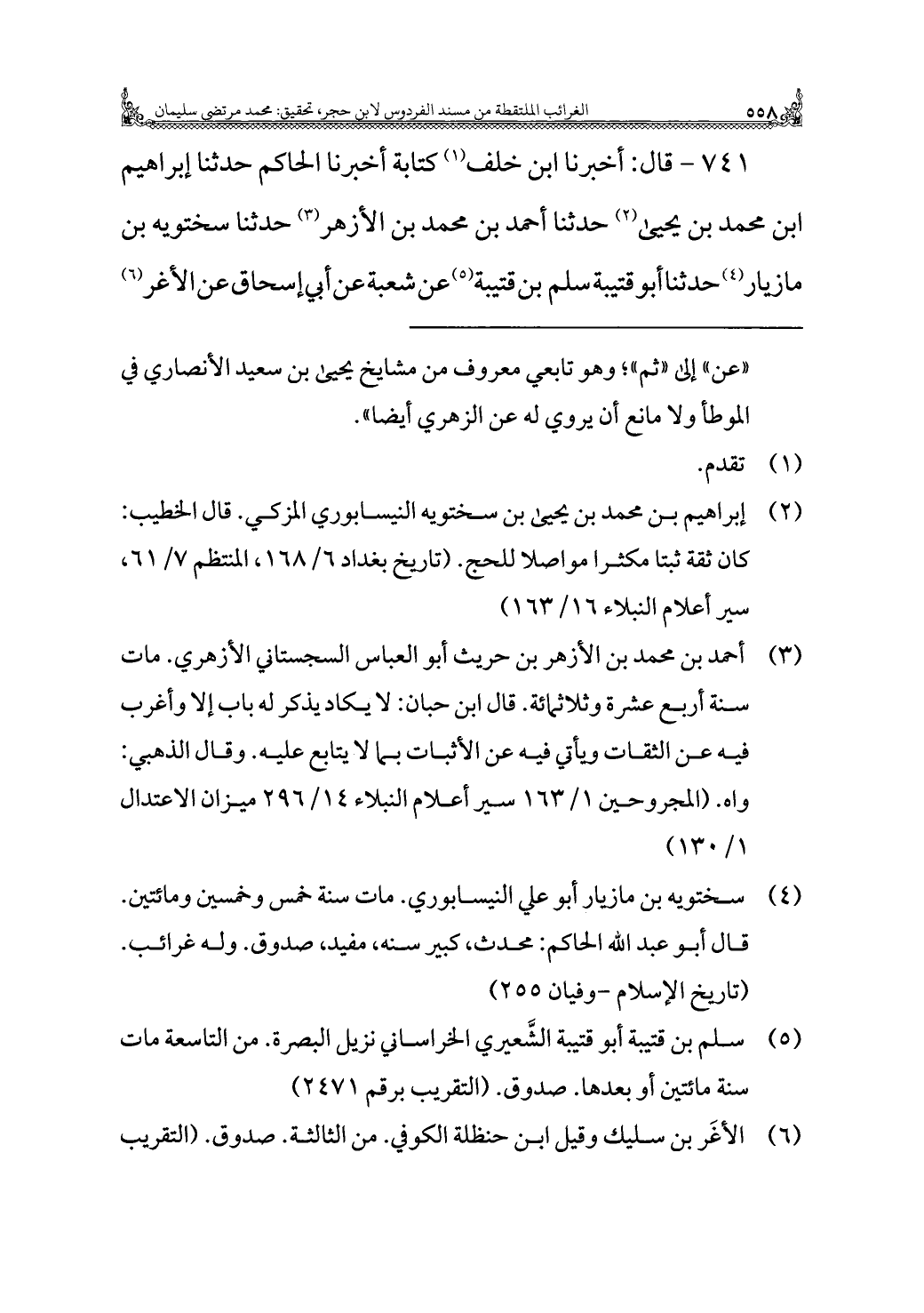 ٧٤١ - قال: أخبرنا ابن خلف (¬١) كتابة أخبرنا الحاكم حدثنا إبراهيم بن محمد بن يحيى (¬٢) حدثنا أحمد بن محمد بن الأزهر (¬٣) حدثنا سختويه بن مازيار (¬٤) حدثنا أبو قتيبة سلم بن قتيبة (¬٥) عن شعبة عن أبي إسحاق عن الأغر (¬٦)