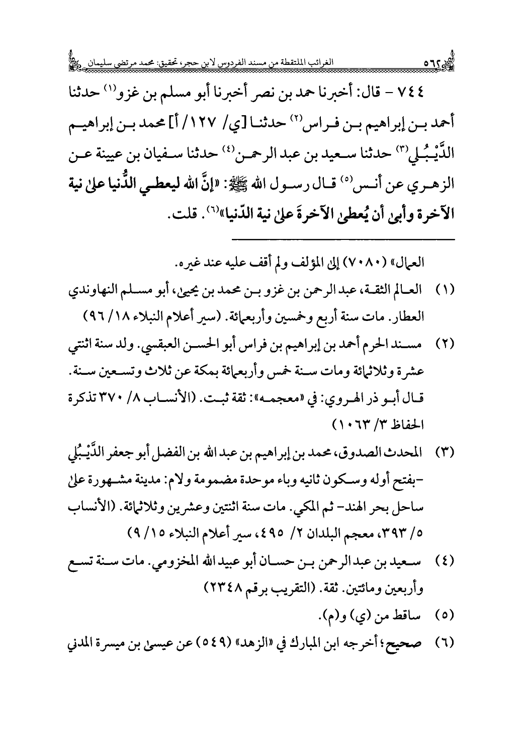 ٧٤٤ - قال: أخبرنا حمد بن نصر أخبرنا أبو مسلم بن غزو (¬١) حدثنا أحمد بن إبراهيم بن فراس (¬٢) حدثنا محمد بن إبراهيم الدَّيْبُلي (¬٣) حدثنا سعيد بن عبد الرحمن (¬٤) حدثنا سفيان بن عيينة عن الزهري عن أنس (¬٥) قال رسول الله - صلى الله عليه وسلم -: "إنَّ الله ليعطي الدنيا على نية الآخرة وأبى أن يُعطى الآخرةَ على نية الدّنيا" (¬٦). قلت.