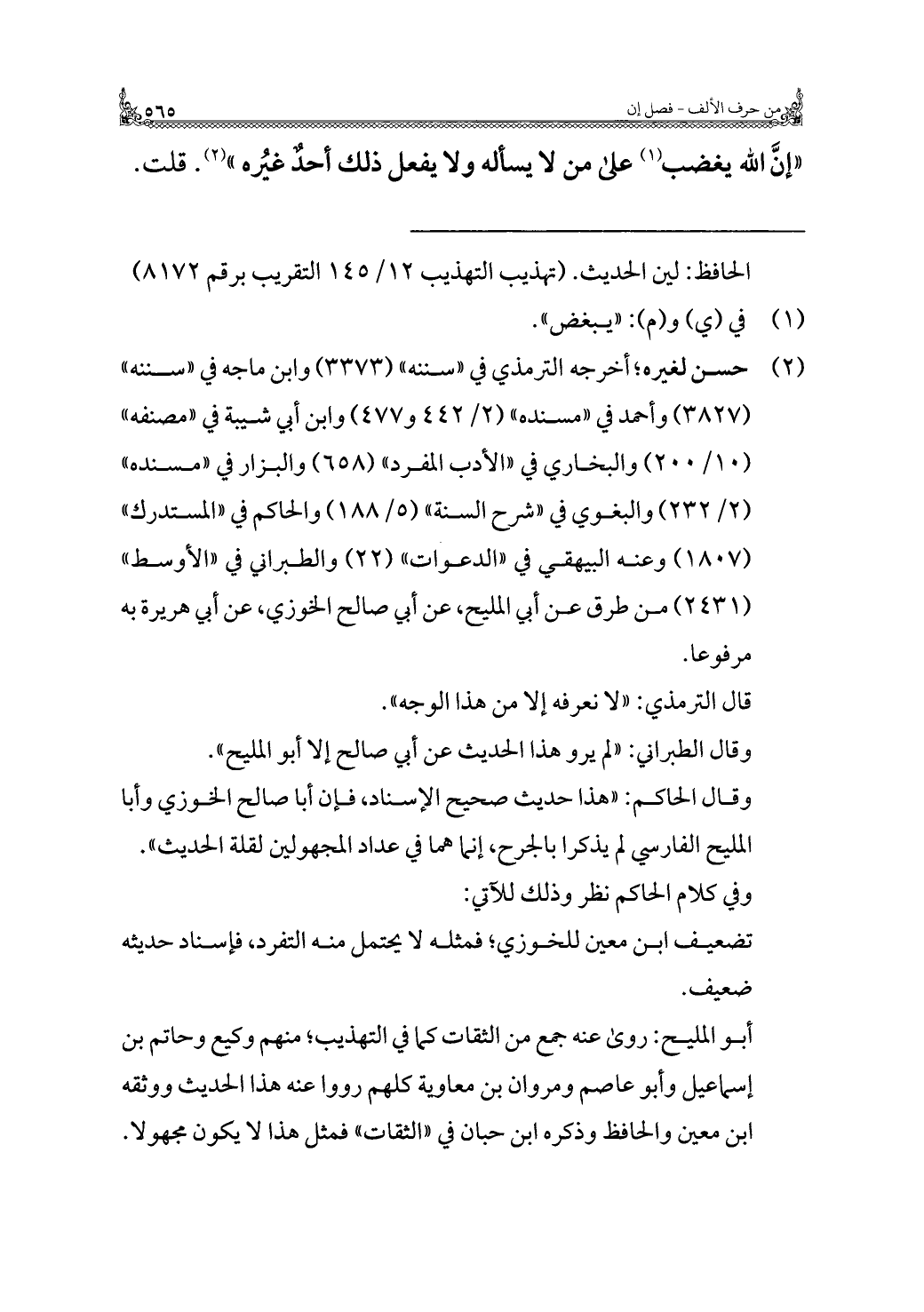 "إنَّ الله يغضب (¬١) على من لا يسأله ولا يفعل ذلك أحدٌ غيُره" (¬٢). قلت.