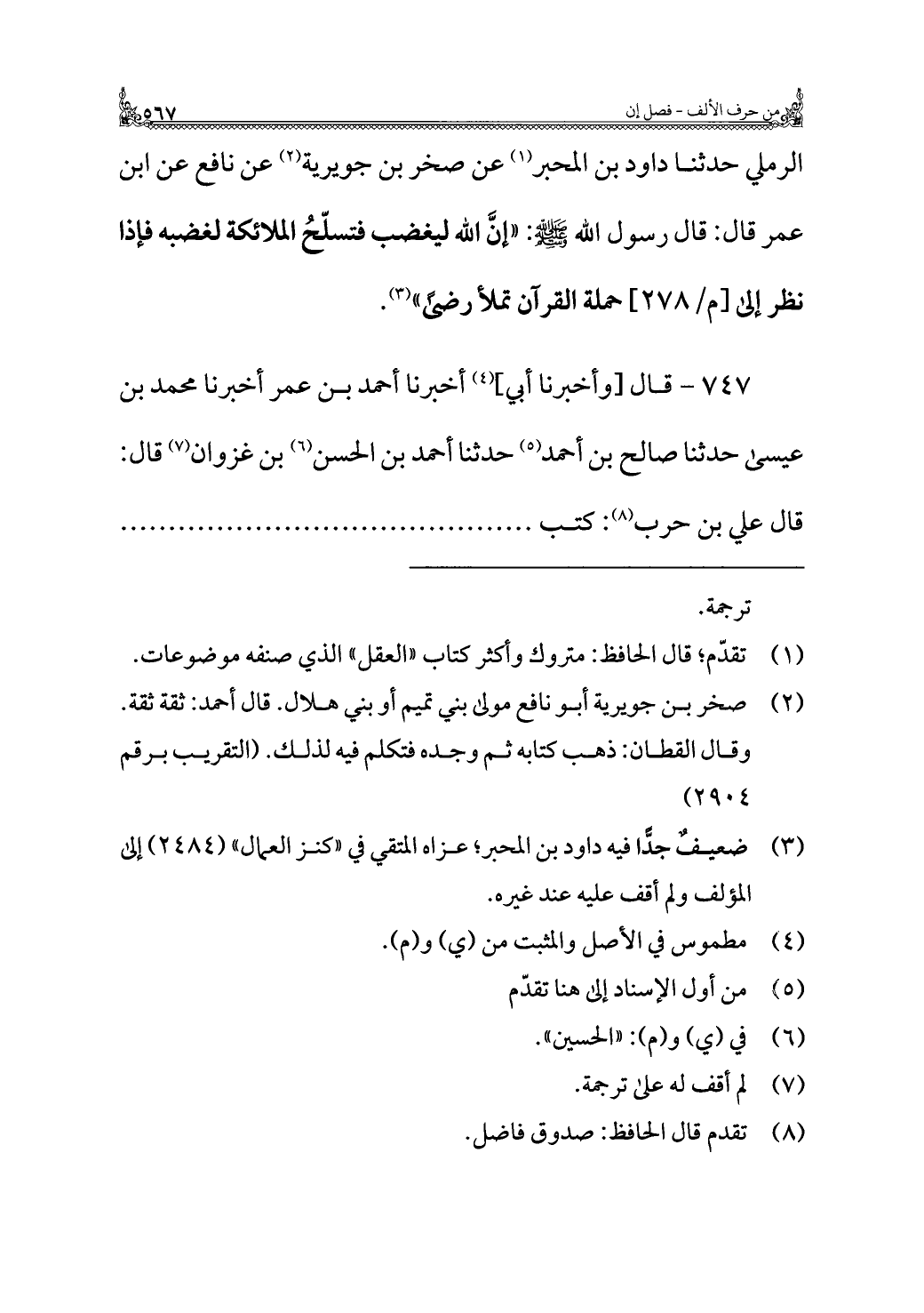 الرملي حدثنا داود بن المحبر (¬١) عن صخر بن جويرية (¬٢) عن نافع عن ابن عمر قال: قال رسول الله - صلى الله عليه وسلم -: "إنَّ الله ليغضب فتسلّحُ الملائكة لغضبه فإذا نظر إلى حملة القرآن تملأ رضًى" (¬٣).