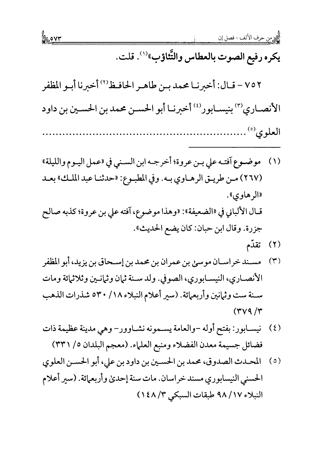 ٧٥٢ - قال: أخبرنا محمد بن طاهر الحافظ (¬٢) أخبرنا أبو المظفر الأنصاري (¬٣) بنيسابور (¬٤) أخبرنا أبو الحسن محمد بن الحسين بن داود العلوي (¬٥)