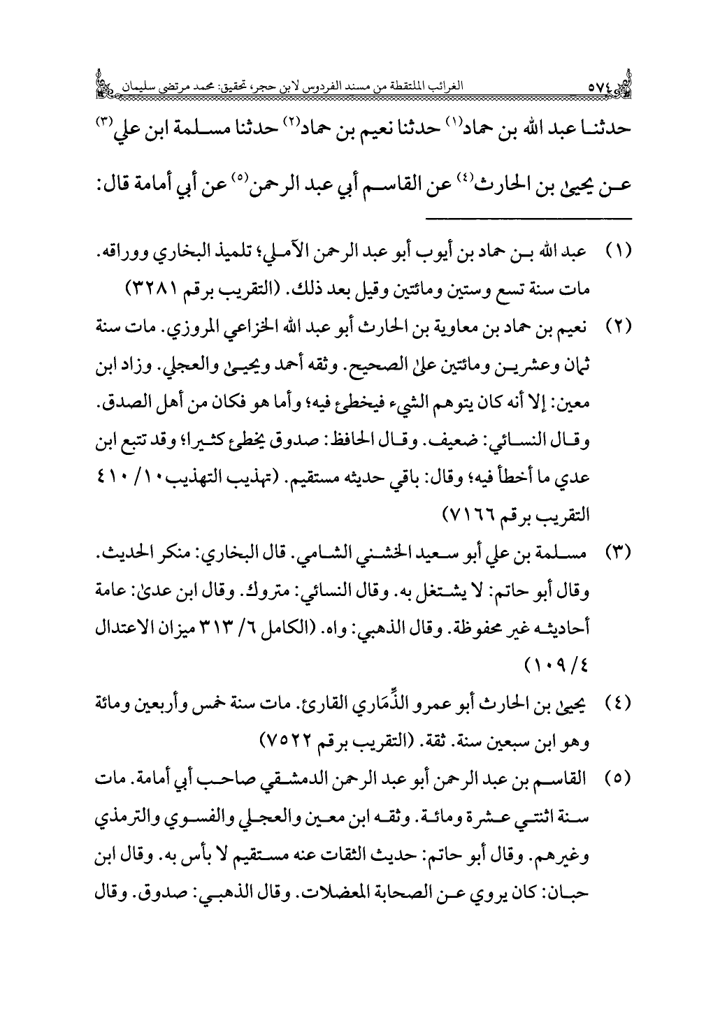 (¬٢) نعيم بن حماد بن معاوية بن الحارث أبو عبد الله الخزاعي المروزي. مات سنة ثمان وعشرين ومائتين على الصحيح. وثقه أحمد ويحيى والعجلي. وزاد ابن معين: إلا أنه كان يتوهم الشيء فيخطئ فيه؛ وأما هو فكان من أهل الصدق. وقال النسائي: ضعيف. وقال الحافظ: صدوق يخطئ كثيرا؛ وقد تتبع ابن عدي ما أخطأ فيه؛ وقال: باقي حديثه مستقيم. (تهذيب التهذيب ١٠/ ٤١٠ التقريب برقم ٧١٦٦)