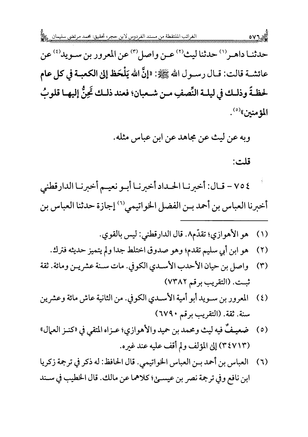 حدثنا داهر (¬١) حدثنا ليث (¬٢) عن واصل (¬٣) عن المعرور بن سويد (¬٤) عن عائشة قالت: قال رسول الله - صلى الله عليه وسلم -: "إنَّ الله يَلْحَظ إلى الكعبة في كل عام لحظةً وذلك في ليلة النِّصفِ من شعبان؛ فعند ذلك تَحِنُّ إليها قلوبُ المؤمنين" (¬٥).