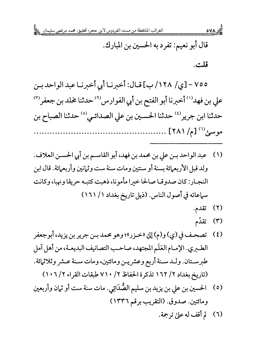 (¬١) عبد الواحد بن علي بن محمد بن فهد، أبو القاسم بن أبي الحسن العلاف. ولد قبل الأربعمائة بسنة أو سنتين ومات سنة ست وثمانين وأربعمائة. قال ابن النجار: كان صدوقا صالحا خيرا مأمونا، ذهبت كتبه حريقا ونهبا، وكانت سماعاته في أصول الناس. (ذيل تاريخ بغداد ١/ ١٦١)