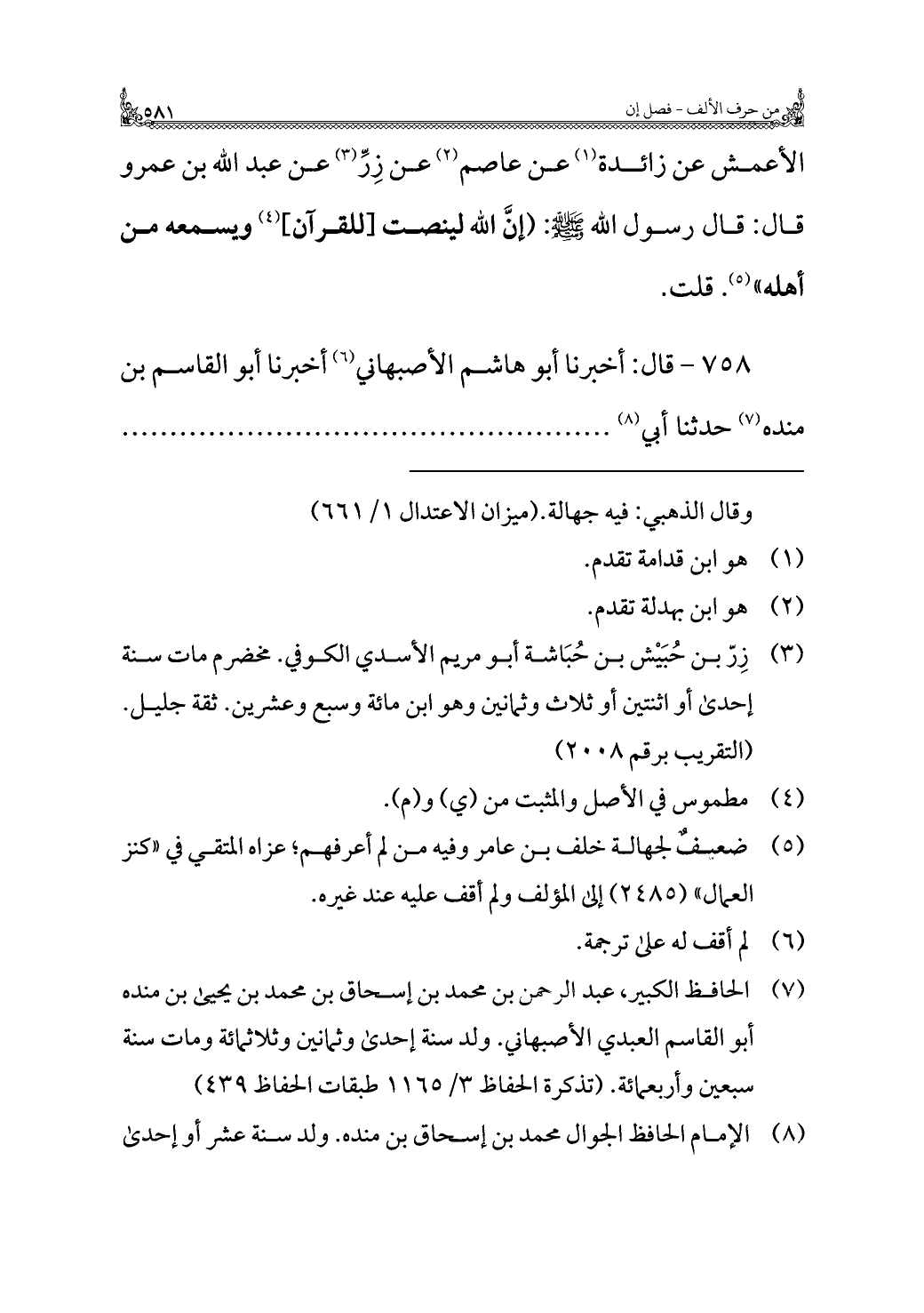 (¬٧) الحافظ الكبير، عبد الرحمن بن محمد بن إسحاق بن محمد بن يحيى بن منده أبو القاسم العبدي الأصبهاني. ولد سنة إحدى وثمانين وثلاثمائة ومات سنة سبعين وأربعمائة. (تذكرة الحفاظ ٣/ ١١٦٥ طبقات الحفاظ ٤٣٩)