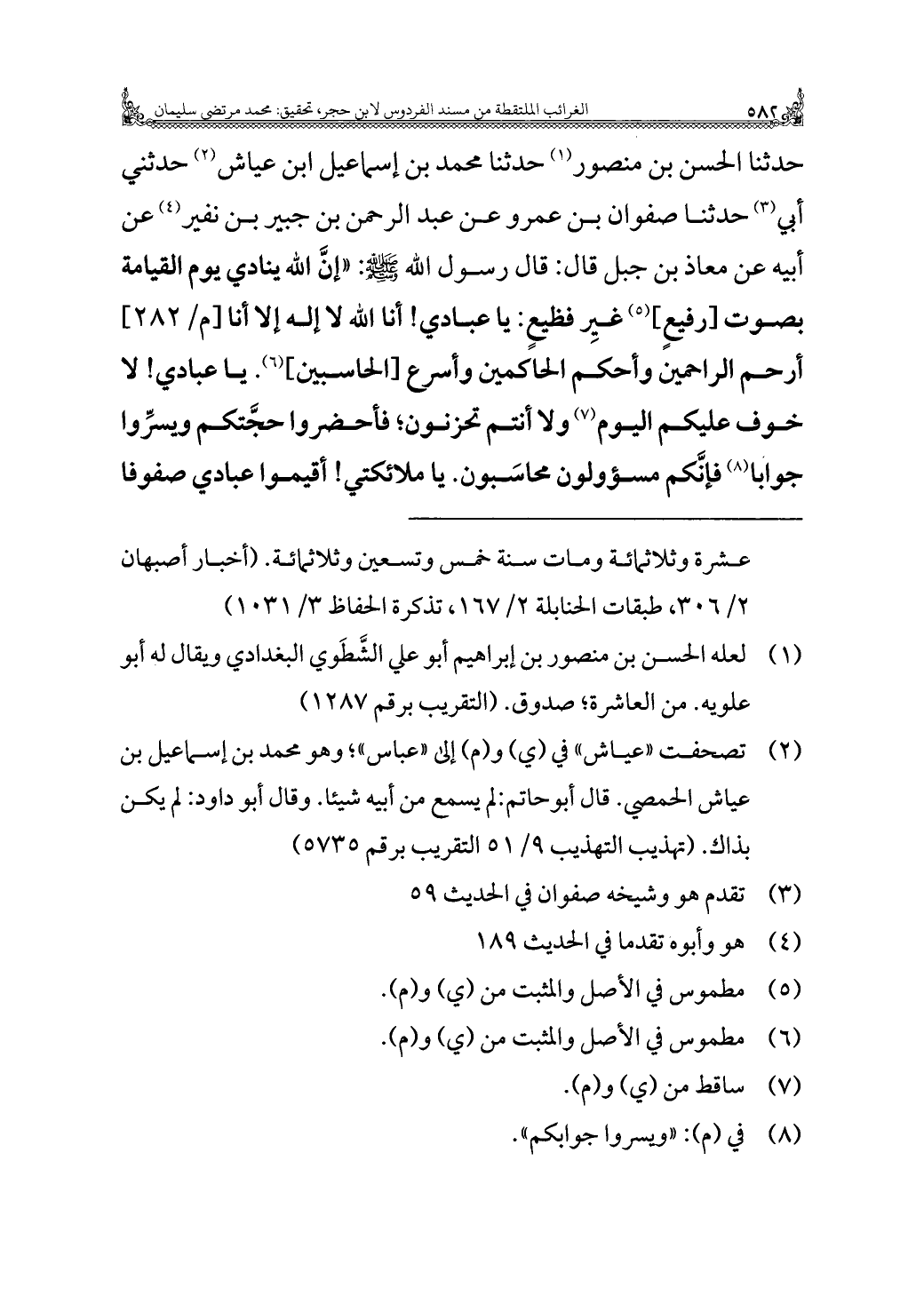 حدثنا الحسن بن منصور (¬١) حدثنا محمد بن إسماعيل ابن عياش (¬٢) حدثني أبي (¬٣) حدثنا صفوان بن عمرو عن عبد الرحمن بن جبير بن نفير (¬٤) عن أبيه عن معاذ بن جبل قال: قال رسول الله - صلى الله عليه وسلم -: "إنَّ الله ينادي يوم القيامة بصوت [رفيعٍ] (¬٥) غيِر فظيعٍ: يا عبادي! أنا الله لا إله إلا أنا أرحم الراحمين وأحكم الحاكمين وأسرع [الحاسبين] (¬٦). يا عبادي! لا خوف عليكم اليوم (¬٧) ولا أنتم تحزنون؛ فأحضروا حجَّتكم ويسرِّوا جوابا (¬٨) فإنَّكم مسؤولون محاسَبون. يا ملائكتي! أقيموا عبادي صفوفا