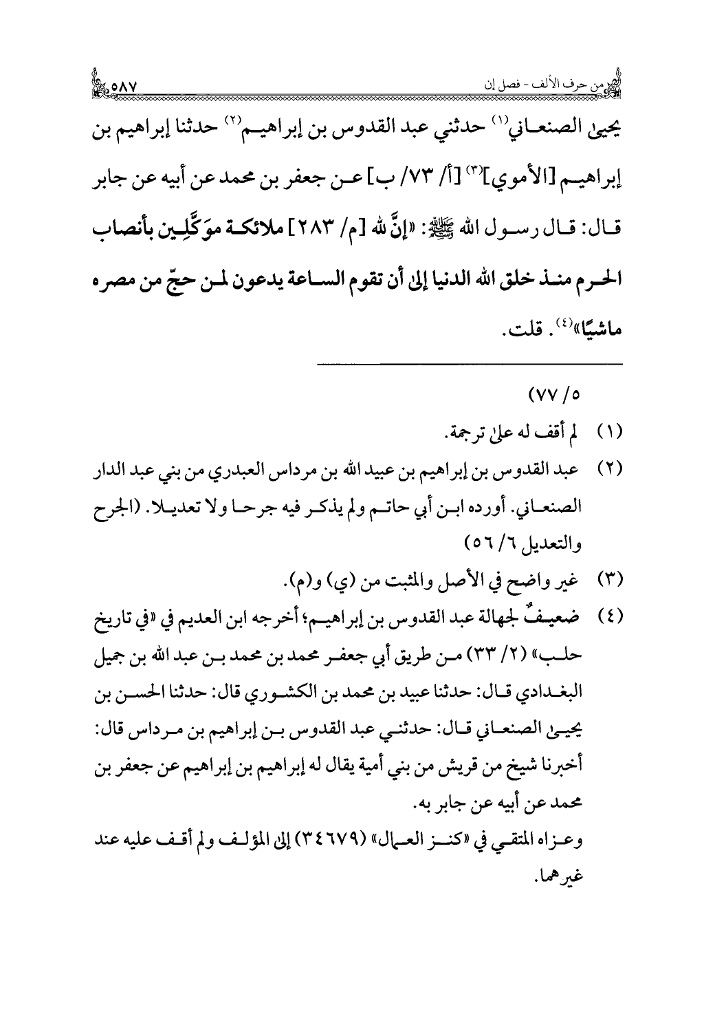 يحيى الصنعاني (¬١) حدثني عبد القدوس بن إبراهيم (¬٢) حدثنا إبراهيم بن إبراهيم [الأموي] (¬٣) عن جعفر بن محمد عن أبيه عن جابر قال: قال رسول الله - صلى الله عليه وسلم -: "إنَّ لله ملائكة موَكَّلِين بأنصاب الحرم منذ خلق الله الدنيا إلى أن تقوم الساعة يدعون لمن حجّ من مصره ماشيًا" (¬٤). قلت.