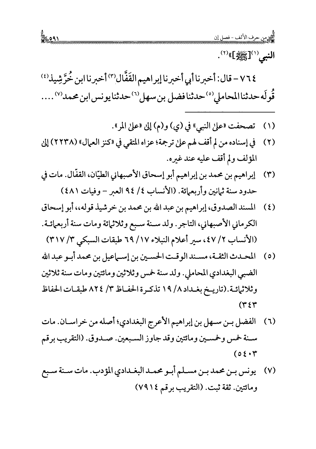 (¬٥) المحدث الثقة، مسند الوقت الحسين بن إسماعيل بن محمد أبو عبد الله الضبي البغدادي المحاملي. ولد سنة خمس وثلاثين ومائتين ومات سنة ثلاثين وثلاثمائة. (تاريخ بغداد ٨/ ١٩ تذكرة الحفاظ ٣/ ٨٢٤ طبقات الحفاظ ٣٤٣)