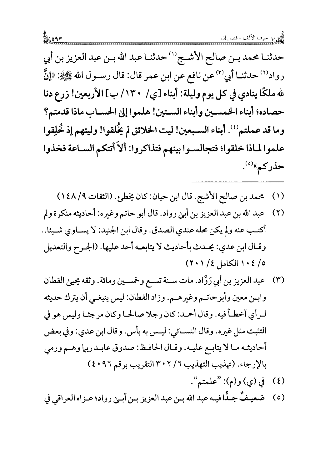 حدثنا محمد بن صالح الأشج (¬١) حدثنا عبد الله بن عبد العزيز بن أبي رواد (¬٢) حدثنا أبي (¬٣) عن نافع عن ابن عمر قال: قال رسول الله - صلى الله عليه وسلم -: "إنَّ لله ملكًا ينادي في كل يوم وليلة: أبناء الأربعين! زرع دنا حصاده؛ أبناء الخمسين وأبناء الستين! هلموا إلى الحساب ماذا قدمتم؟ وما قد عملتم (¬٤). أبناء السبعين! ليت الخلائق لم يخُلقوا! وليتهم إذ خُلِقوا علموا لماذا خلقوا؛ فتجالسوا بينهم فتذاكروا: ألَا أتتكم الساعة فخذوا حذركم" (¬٥).