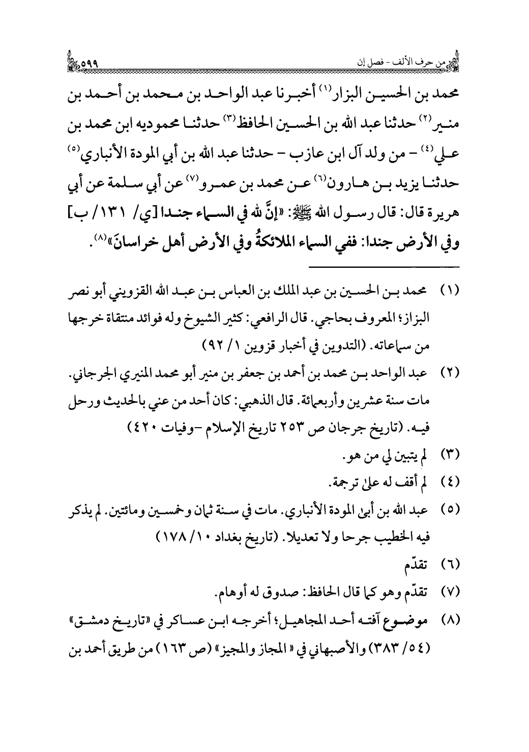 محمد بن الحسين البزار (¬١) أخبرنا عبد الواحد بن محمد بن أحمد بن منير (¬٢) حدثنا عبد الله بن الحسين الحافظ (¬٣) حدثنا محموديه ابن محمد بن علي (¬٤) - من ولد آل ابن عازب - حدثنا عبد الله بن أبي المودة الأنباري (¬٥) حدثنا يزيد بن هارون (¬٦) عن محمد بن عمرو (¬٧) عن أبي سلمة عن أبي هريرة قال: قال رسول الله - صلى الله عليه وسلم -: "إنَّ لله في السماء جندا وفي الأرض جندا: ففي السماء الملائكةُ وفي الأرض أهل خراسانَ" (¬٨).