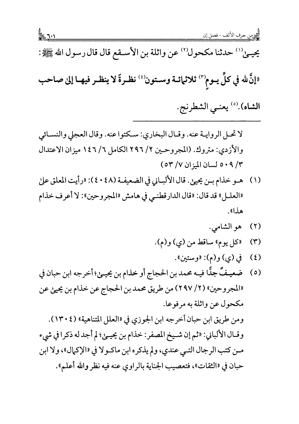 (¬٥) ضعيفٌ جدًّا فيه محمد بن الحجاج أو خذام بن يحيى؛ أخرجه ابن حبان في "المجروحين" (٢/ ٢٩٧) من طريق محمد بن الحجاج عن خذام بن يحيى عن مكحول عن واثلة به مرفوعا.