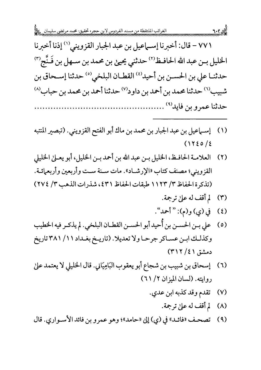 (¬٢) العلامة الحافظ، الخليل بن عبد الله بن أحمد بن الخليل، أبو يعلى الخليلي القزويني؛ مصنف كتاب "الإرشاد". مات سنة ست وأربعين وأربعمائة. (تذكرة الحفاظ ٣/ ١١٢٣ طبقات الحفاظ ٤٣١، شذرات الذهب ٣/ ٢٧٤)
