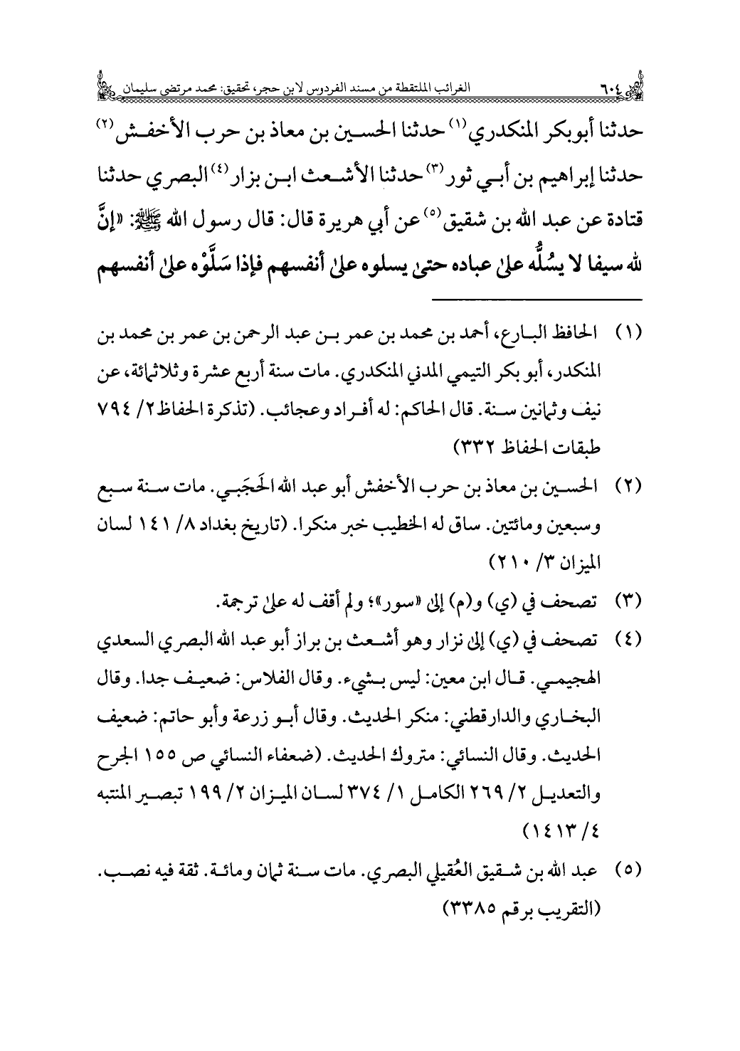 حدثنا أبو بكر المنكدري (¬١) حدثنا الحسين بن معاذ بن حرب الأخفش (¬٢) حدثنا إبراهيم بن أبي ثور (¬٣) حدثنا الأشعث ابن بزار (¬٤) البصري حدثنا قتادة عن عبد الله بن شقيق (¬٥) عن أبي هريرة قال: قال رسول الله - صلى الله عليه وسلم -: "إنَّ لله سيفا لا يسُلُّه على عباده حتى يسلوه على أنفسهم فإذا سَلَّوْه على أنفسهم