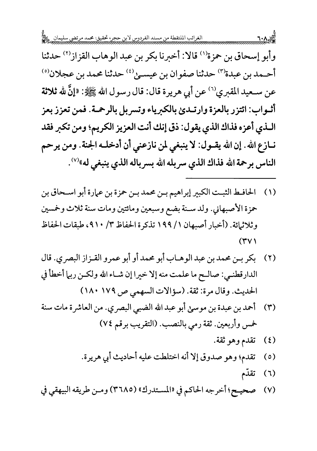 وأبو إسحاق بن حمزة (¬١) قالا: أخبرنا بكر بن عبد الوهاب القزاز (¬٢) حدثنا أحمد بن عبدة (¬٣) حدثنا صفوان بن عيسى (¬٤) حدثنا محمد بن عجلان (¬٥) عن سعيد المقبري (¬٦) عن أبي هريرة قال: قال رسول الله - صلى الله عليه وسلم -: "إنَّ لله ثلاثة أثواب: ائتزر بالعزة وارتدى بالكبرياء وتسربل بالرحمة. فمن تعزز بعز الذي أعزه فذاك الذي يقول: ذق إنك أنت العزيز الكريم؛ ومن تكبر فقد نازع الله. إن الله يقول: لا ينبغي لمن نازعني أن أدخله الجنة. ومن يرحم الناس برحمة الله فذاك الذي سربله الله بسرباله الذي ينبغي له" (¬٧).
