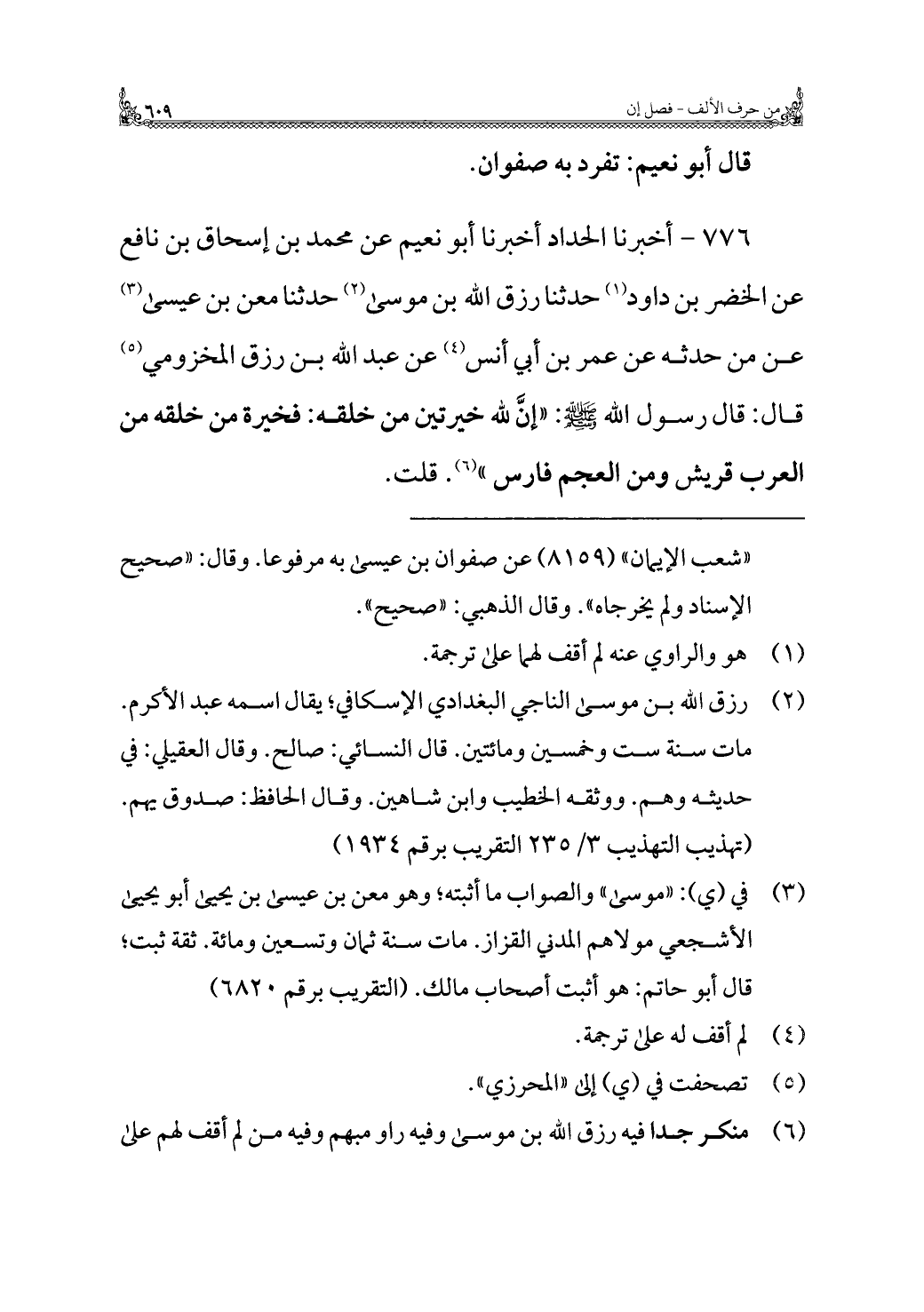 ٧٧٦ - أخبرنا الحداد أخبرنا أبو نعيم عن محمد بن إسحاق بن نافع عن الخضر بن داود (¬١) حدثنا رزق الله بن موسى (¬٢) حدثنا معن بن عيسى (¬٣) عن من حدثه عن عمر بن أبي أنس (¬٤) عن عبد الله بن رزق المخزومي (¬٥) قال: قال رسول الله - صلى الله عليه وسلم -: "إنَّ لله خيرتين من خلقه: فخيرة من خلقه من العرب قريش ومن العجم فارس" (¬٦). قلت.