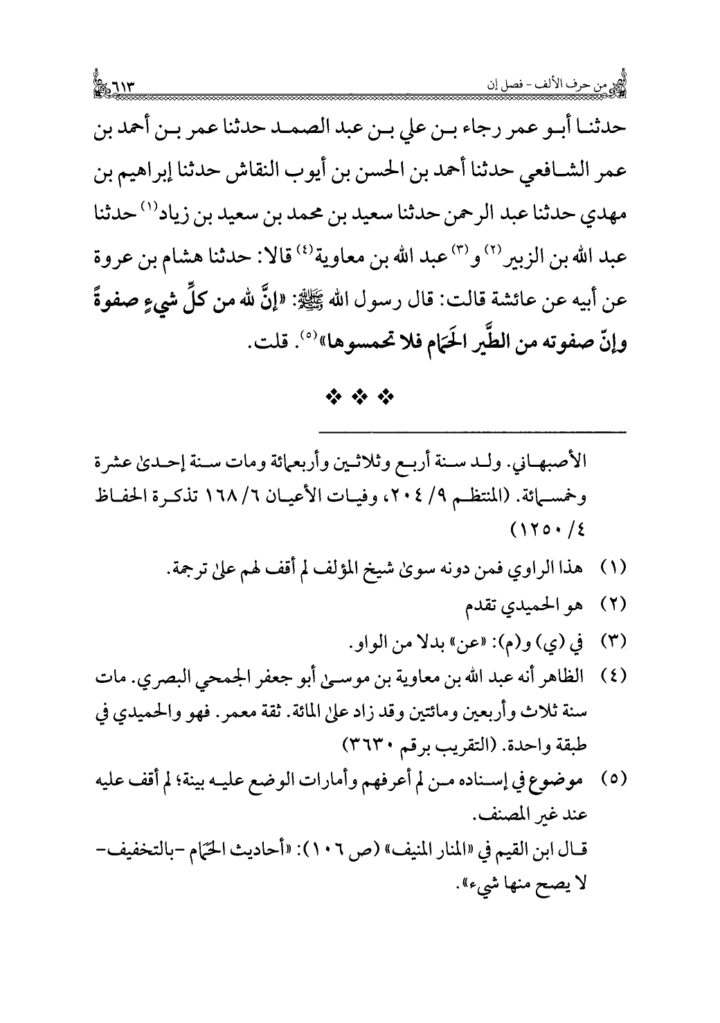 حدثنا أبو عمر رجاء بن علي بن عبد الصمد حدثنا عمر بن أحمد بن عمر الشافعي حدثنا أحمد بن الحسن بن أيوب النقاش حدثنا إبراهيم بن مهدي حدثنا عبد الرحمن حدثنا سعيد بن محمد بن سعيد بن زياد (¬١) حدثنا عبد الله بن الزبير (¬٢) و (¬٣) عبد الله بن معاوية (¬٤) قالا: حدثنا هشام بن عروه عن أبيه عن عائشة قالت: قال رسول الله - صلى الله عليه وسلم -: "إنَّ لله من كلِّ شيءٍ صفوةً وإنّ صفوته من الطَّير الحَمَام فلا تحمسوها" (¬٥). قلت.