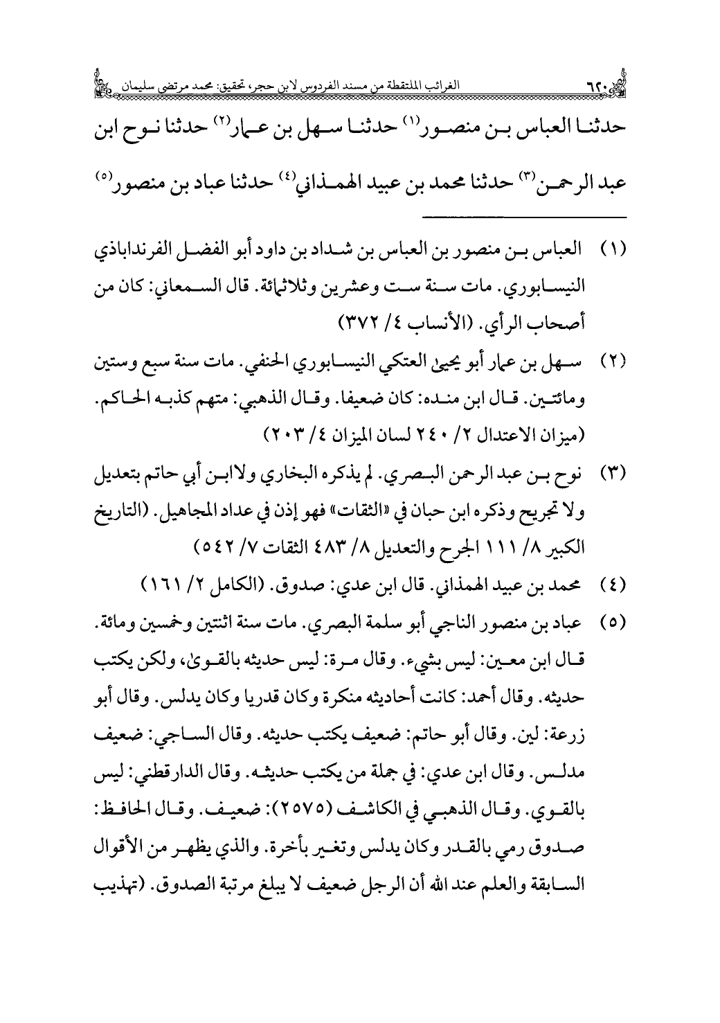 حدثنا العباس بن منصور (¬١) حدثنا سهل بن عمار (¬٢) حدثنا نوح بن عبد الرحمن (¬٣) حدثنا محمد بن عبيد الهمذاني (¬٤) حدثنا عباد بن منصور (¬٥)