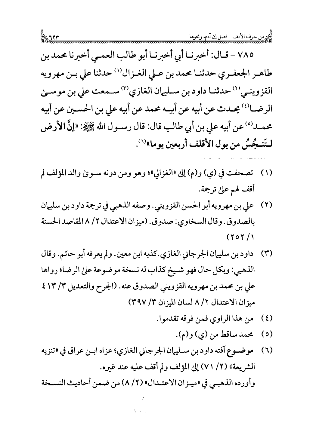 ٧٨٥ - قال: أخبرنا أبي أخبرنا أبو طالب العمي أخبرنا محمد بن طاهر الجعفري حدثنا محمد بن علي الغزال (¬١) حدثنا علي بن مهرويه القزويني (¬٢) حدثنا داود بن سليمان الغازي (¬٣) سمعمت علي بن موسى الرضا (¬٤) يحدث عن أبيه عن أبيه محمد عن أبيه علي بن الحسين عن أبيه محمد (¬٥) عن أبيه علي بن أبي طالب قال: قال رسول الله - صلى الله عليه وسلم -: "إنَّ الأرض لتَنجُسُ من بول الأقلف أربعين يوما" (¬٦).