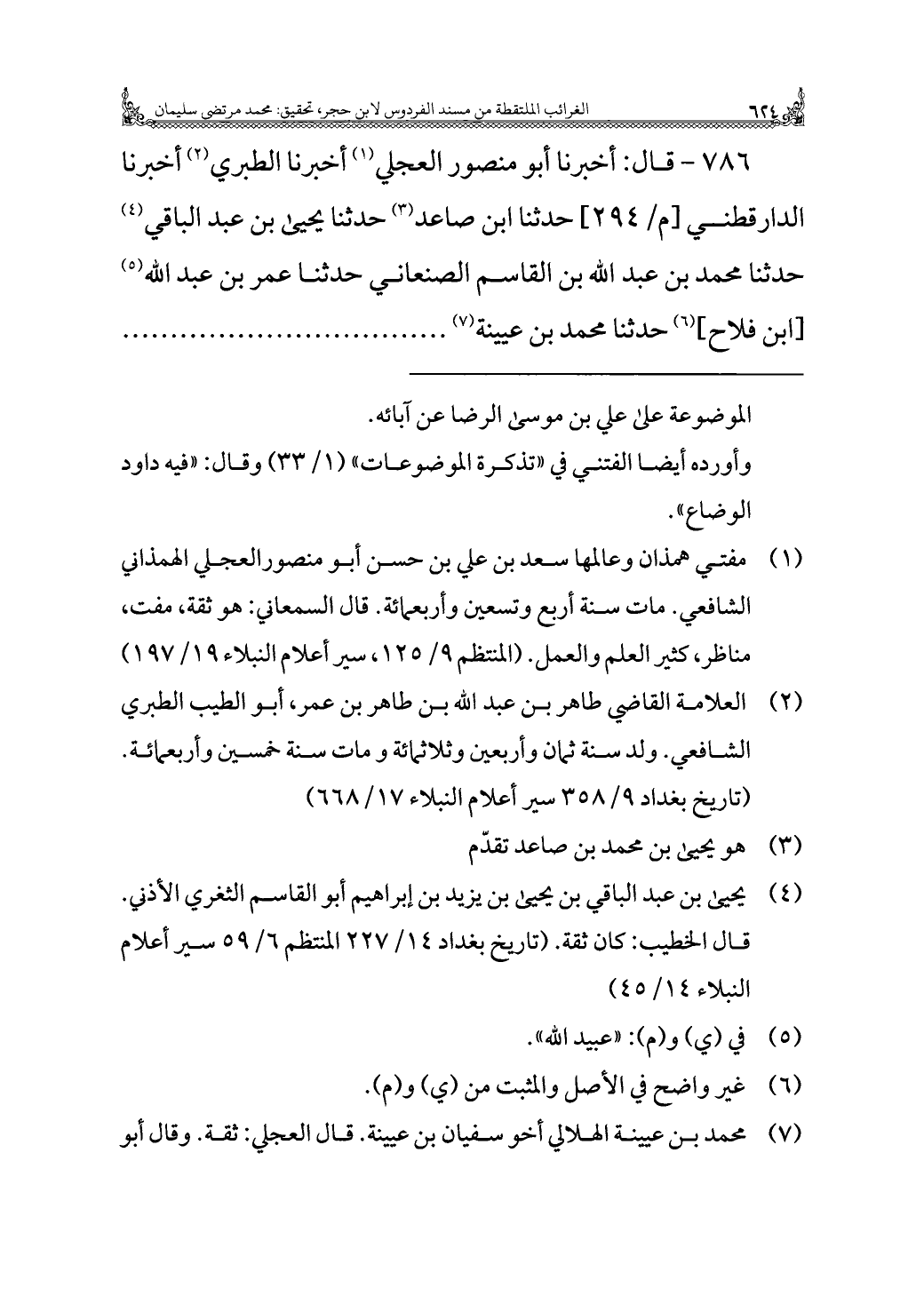 ٧٨٦ - قال: أخبرنا أبو منصور العجلي (¬١) أخبرنا الطبري (¬٢) أخبرنا الدارقطني حدثنا ابن صاعد (¬٣) حدثنا يحيى بن عبد الباقي (¬٤) حدثنا محمد بن عبد الله بن القاسم الصنعاني حدثنا عمر بن عبد الله (¬٥) [ابن فلاح] (¬٦) حدثنا محمد بن عيينة (¬٧)