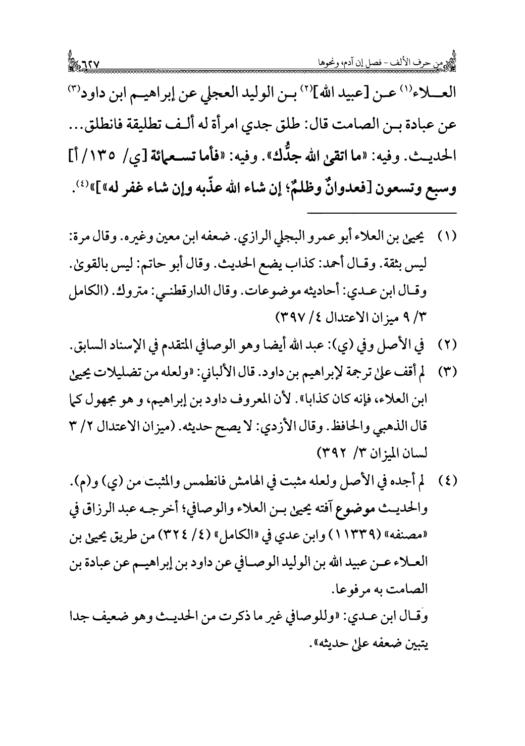 العلاء (¬١) عن [عبيد الله] (¬٢) بن الوليد العجلي عن إبراهيم بن داود (¬٣) عن عبادة بن الصامت قال: طلق جدي امرأة له ألف تطليقة فانطلق ... الحديث. وفيه: "ما اتقى الله جدُّك". وفيه: "فأما تسعمائة وسبع وتسعون [فعدوانٌ وظلمٌ؛ إن شاء الله عذّبه وإن شاء غفر له"] " (¬٤).