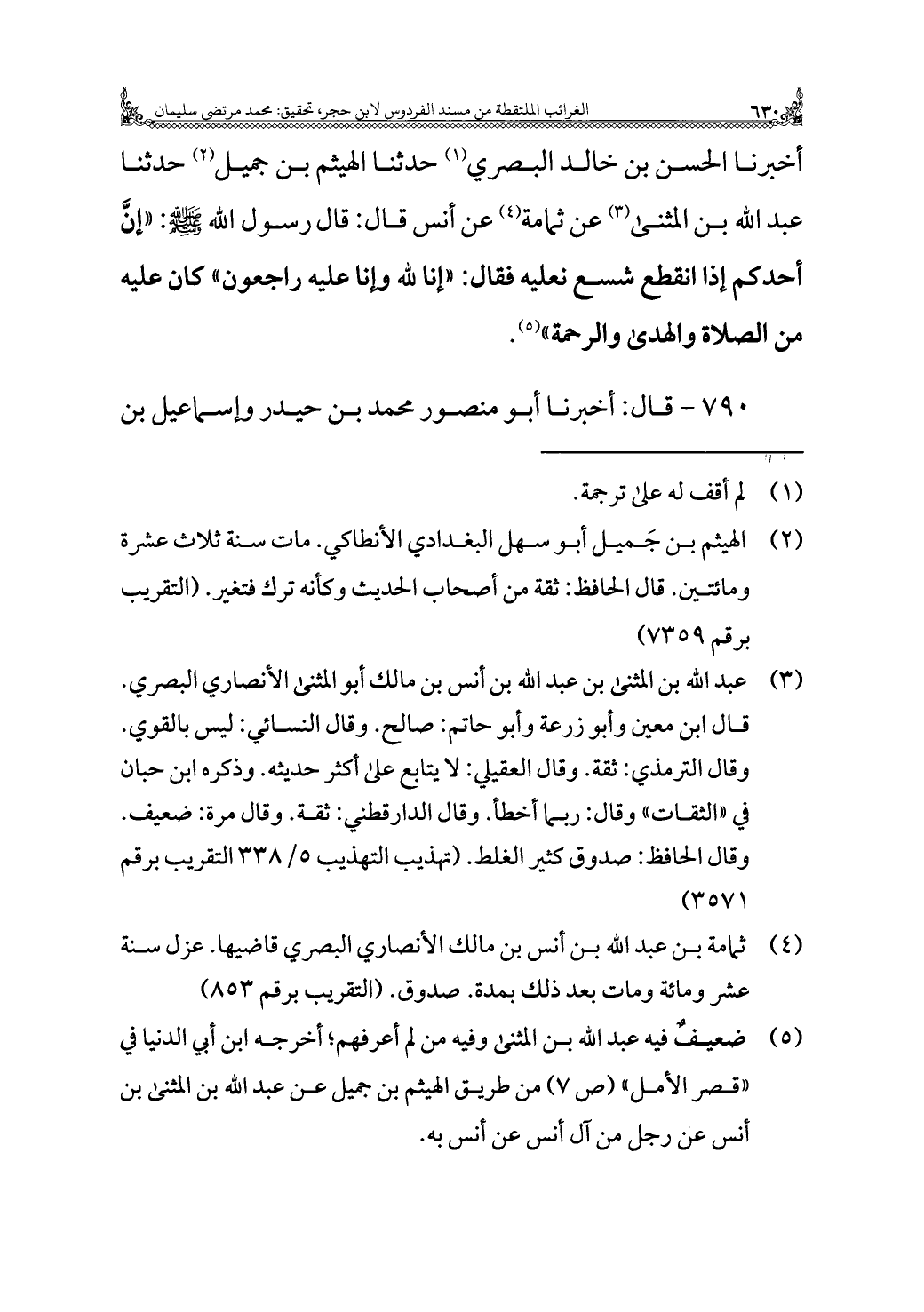 أخبرنا الحسن بن خالد البصري (¬١) حدثنا الهيثم بن جميل (¬٢) حدثنا عبد الله بن المثنى (¬٣) عن ثمامة (¬٤) عن أنس قال: قال رسول الله - صلى الله عليه وسلم -: "إنَّ أحدكم إذا انقطع شسع نعليه فقال: "إنا لله وإنا عليه راجعون" كان عليه من الصلاة والهدى والرحمة" (¬٥).