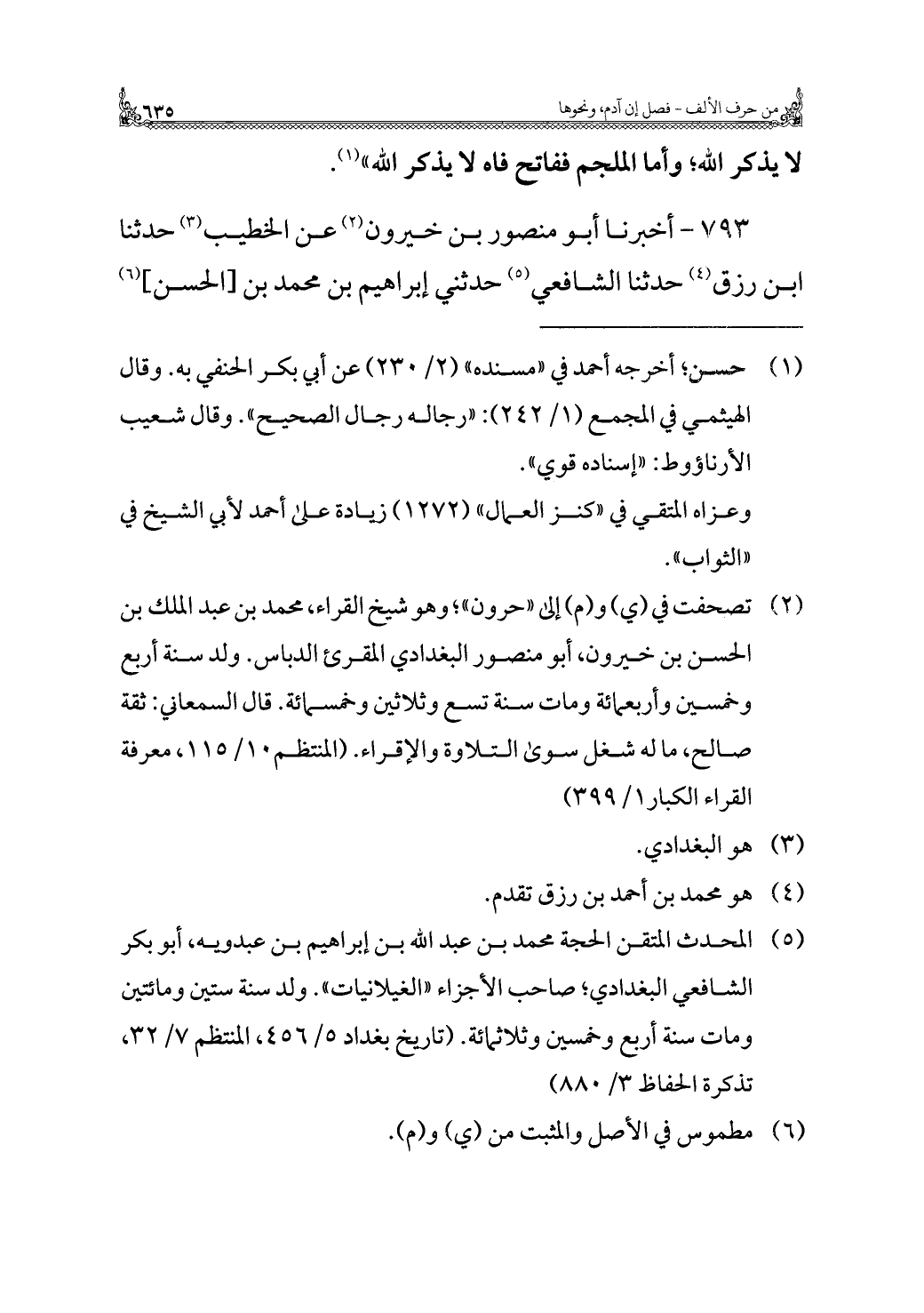 ٧٩٣ - أخبرنا أبو منصور بن خيرون (¬٢) عن الخطيب (¬٣) حدثنا رزق (¬٤) حدثنا الشافعي (¬٥) حدثني إبراهيم بن محمد بن [الحسن] (¬٦)