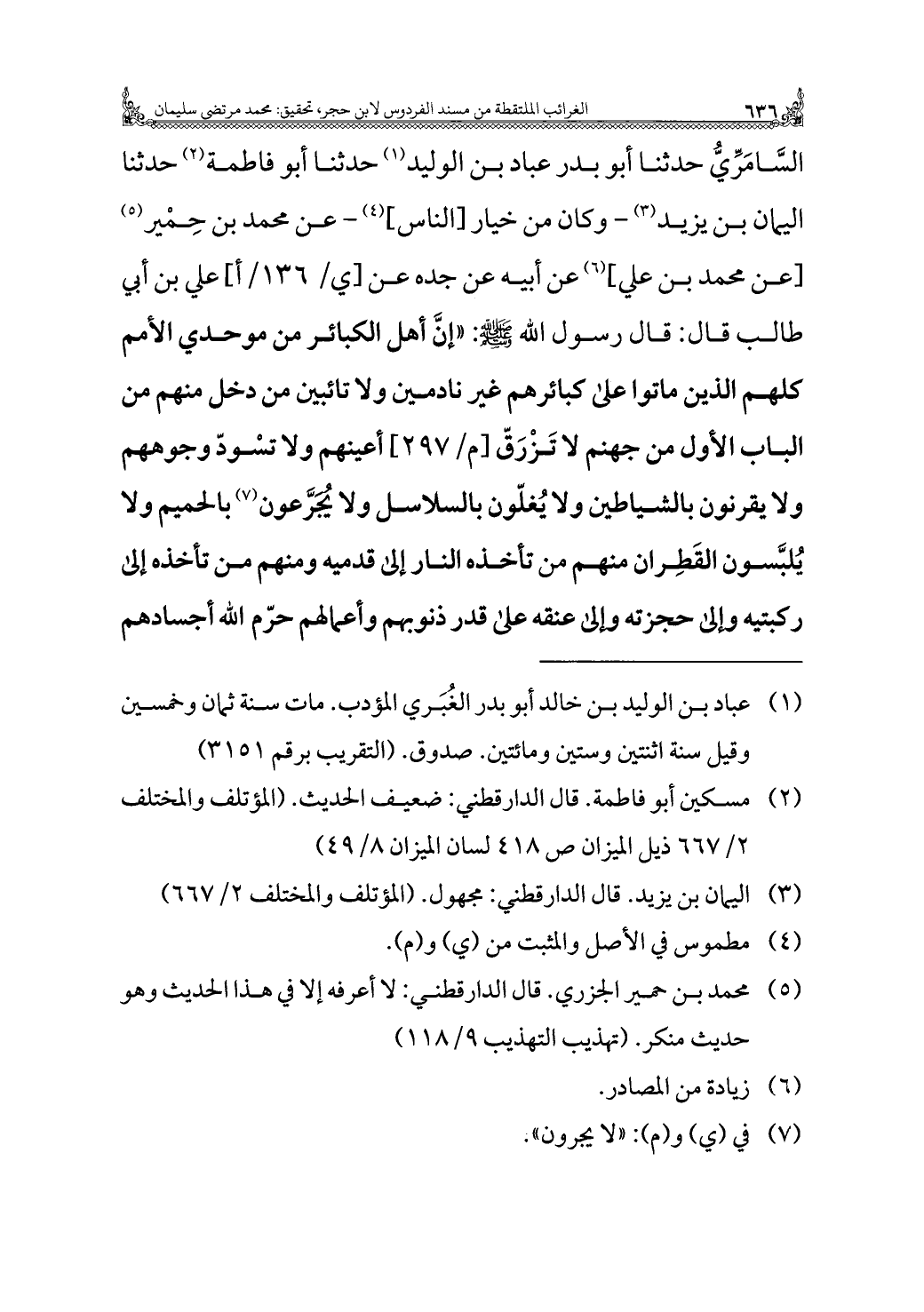 السَّامَرِّيُّ حدثنا أبو بدر عباد بن الوليد (¬١) حدثنا أبو فاطمة (¬٢) حدثنا اليمان بن يزيد (¬٣) - وكان من خيار [الناس] (¬٤) - عن محمد بن حِمْير (¬٥) [عن محمد بن علي] (¬٦) عن أبيه عن جده عن علي بن أبي طالب قال: قال رسول الله - صلى الله عليه وسلم -: "إنَّ أهل الكبائر من موحدي الأمم كلهم الذين ماتوا على كبائرهم غير نادمين ولا تائبين من دخل منهم من الباب الأول من جهنم لا تَزْرَقّ أعينهم ولا تسْودّ وجوههم ولا يقرنون بالشياطين ولا يُغلّون بالسلاسل ولا يجرَّعون (¬٧) بالحميم ولا يُلبَّسون القَطِران منهم من تأخذه النار إلى قدميه ومنهم من تأخذه إلى ركبتيه وإلى حجزته وإلى عنقه على قدر ذنوبهم وأعمالهم حرّم الله أجسادهم