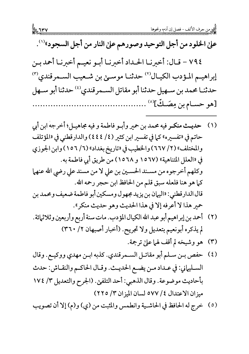 ٧٩٤ - قال: أخبرنا الحداد أخبرنا أبو نعيم أخبرنا أحمد بن إبراهيم المؤدب الكيال (¬٢) حدثنا موسى بن شعيب السمرقندي (¬٣) حدثنا محمد بن سهيل حدثنا أبو مقاتل السمرقندي (¬٤) حدثنا أبو سهل [هو حسام بن مِصَكّ] (¬٥)