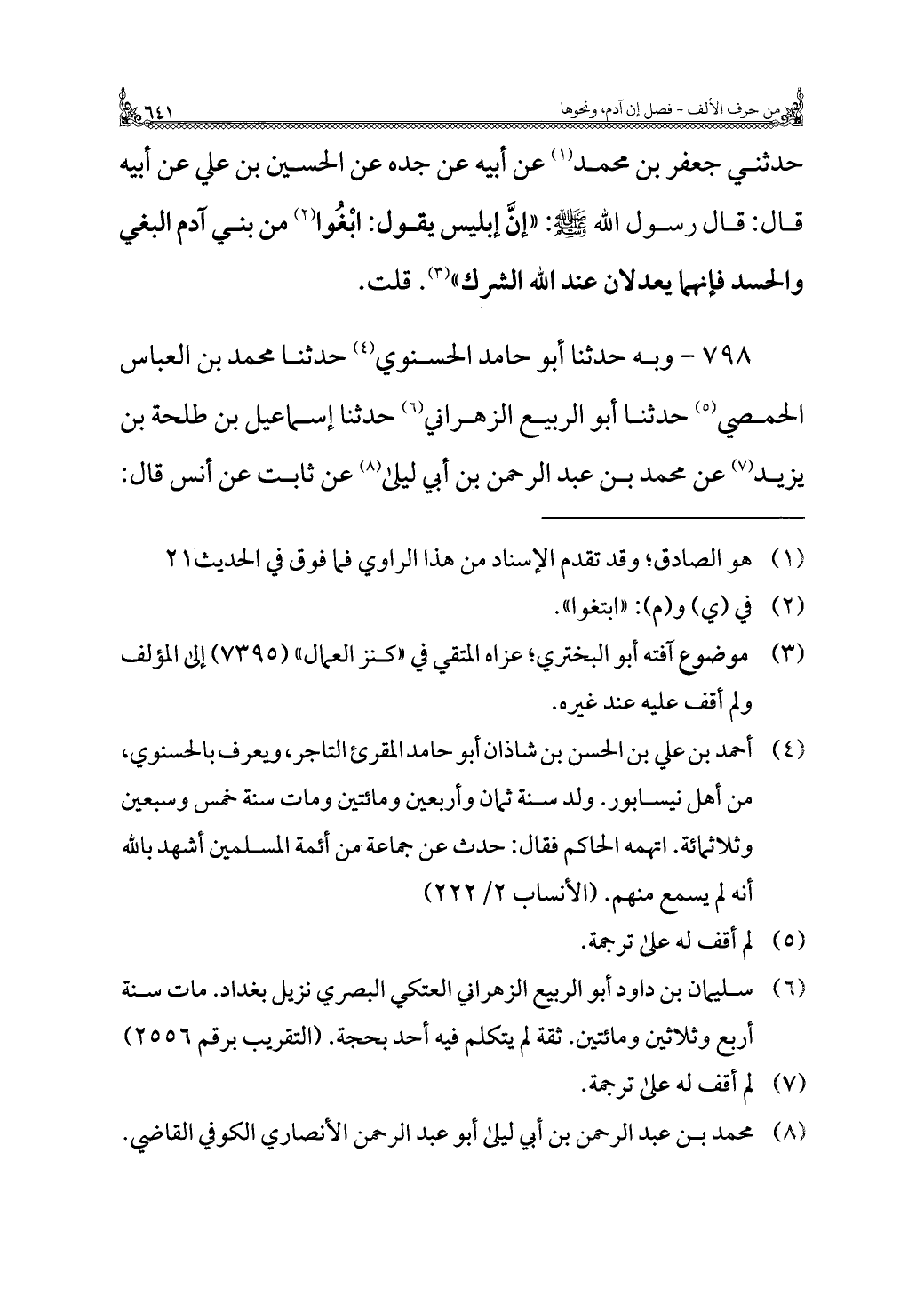 حدثني جعفر بن محمد (¬١) عن أبيه عن جده عن الحسين بن علي عن أبيه قال: قال رسول الله - صلى الله عليه وسلم -: "إنَّ إبليس يقول: ابْغُوا (¬٢) من بني آدم البغي والحسد فإنهما يعدلان عند الله الشرك" (¬٣). قلت.