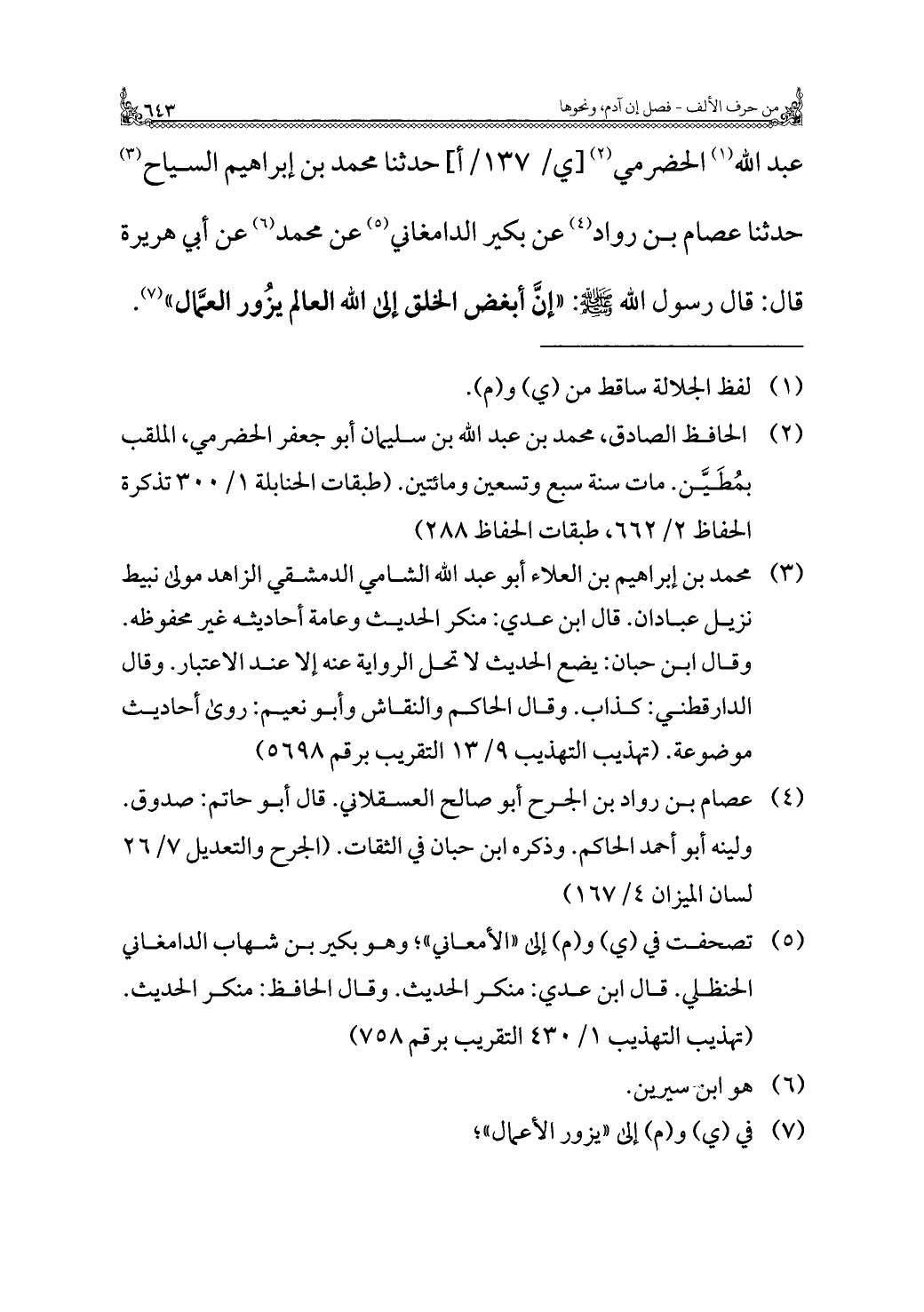 عبد الله (¬١) الحضرمي (¬٢) حدثنا محمد بن إبراهيم السياح (¬٣) حدثنا عصام بن رواد (¬٤) عن بكير الدامغاني (¬٥) عن محمد (¬٦) عن أبي هريرة قال: قال رسول الله - صلى الله عليه وسلم -: "إنَّ أبغض الخلق إلى الله العالم يزُور العمَّال" (¬٧).