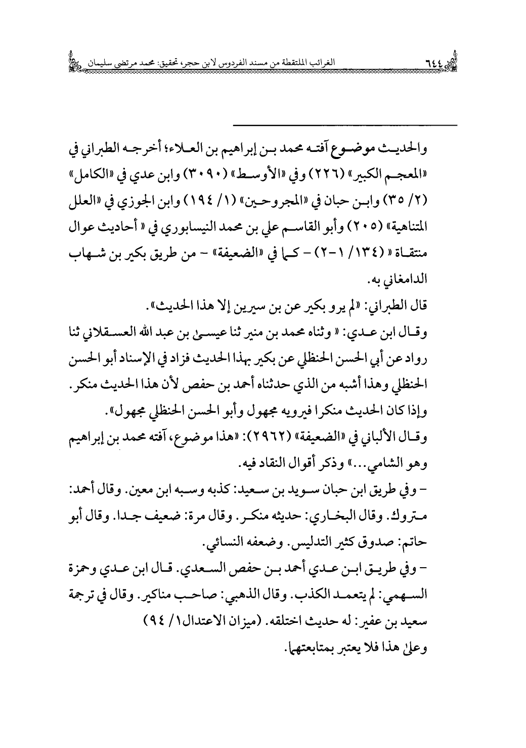 - وفي طريق ابن عدي أحمد بن حفص السعدي. قال ابن عدي وحمزة السهمي: لم يتعمد الكذب. وقال الذهبي: صاحب مناكير. وقال في ترجمة سعيد بن عفير: له حديث اختلقه. (ميزان الاعتدال ١/ ٩٤)