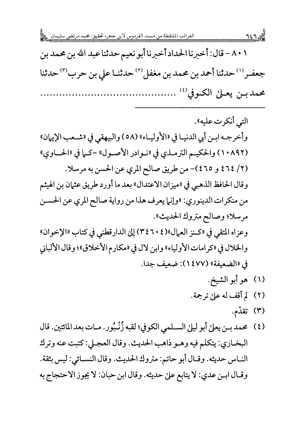 ٨٠١ - قال: أخبرنا الحداد أخبرنا أبو نعيم حدثنا عبد الله بن محمد بن جعفر (¬١) حدثنا أحمد بن محمد بن مغفل (¬٢) حدثنا علي بن حرب (¬٣) حدثنا محمد بن يعلى الكوفي (¬٤)