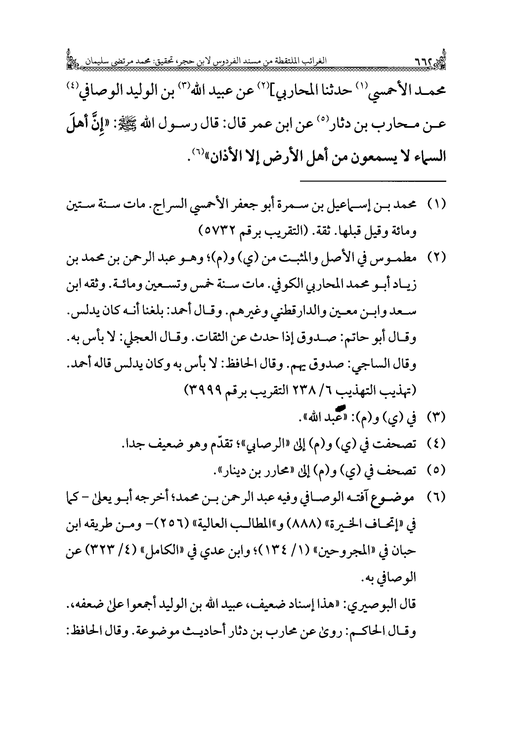 محمد الأحمسي (¬١) حدثنا المحاربي] (¬٢) عن عبيد الله (¬٣) بن الوليد الوصافي (¬٤) عن محارب بن دثار (¬٥) عن ابن عمر قال: قال رسول الله - صلى الله عليه وسلم -: "إِنَّ أهلَ السماء لا يسمعون من أهل الأرض إلا الأذان" (¬٦).