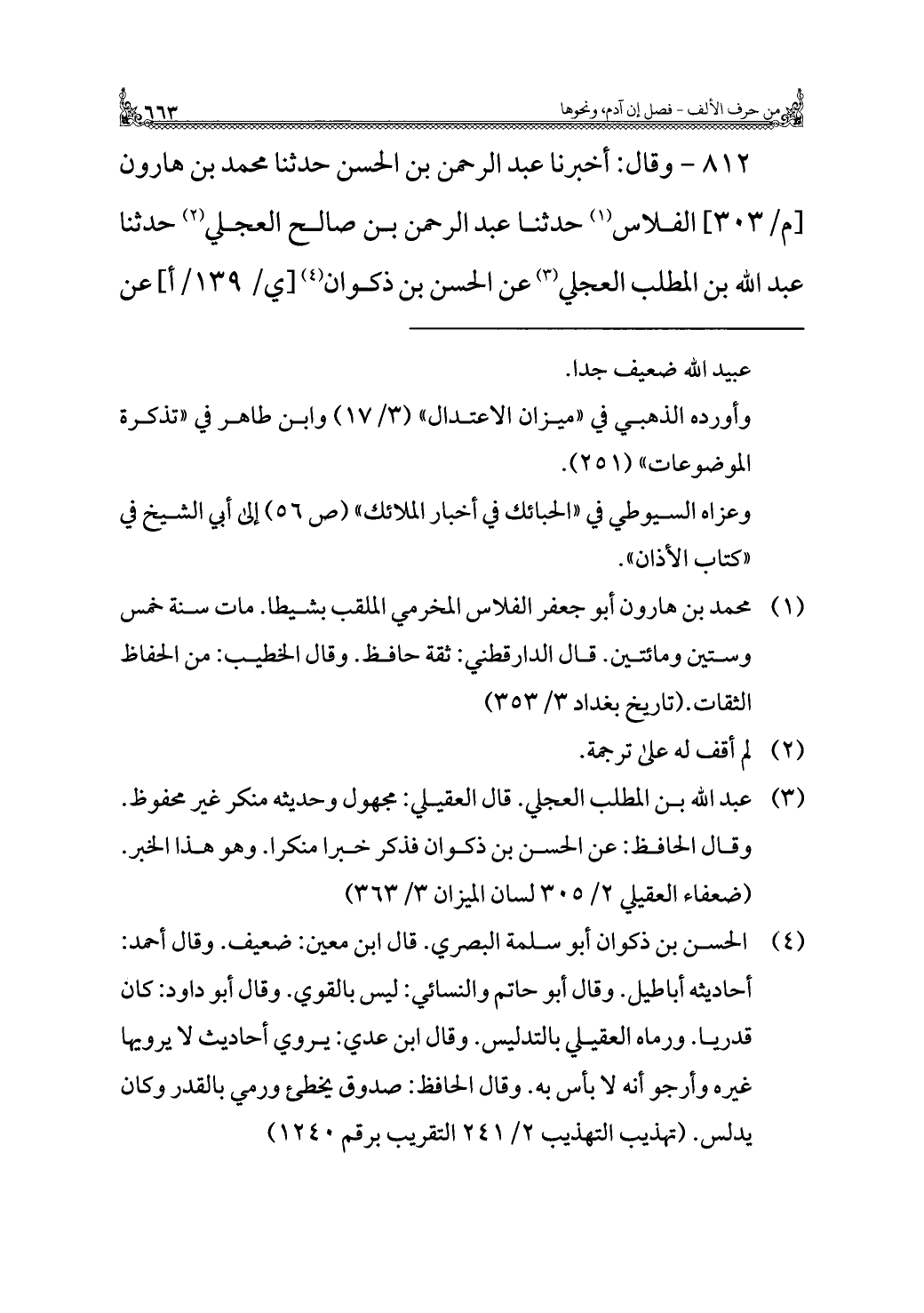 ٨١٢ - وقال: أخبرنا عبد الرحمن بن الحسن حدثنا محمد بن هارون الفلاس (¬١) حدثنا عبد الرحمن بن صالح العجلي (¬٢) حدثنا عبد الله بن المطلب العجلي (¬٣) عن الحسن بن ذكوان (¬٤) عن