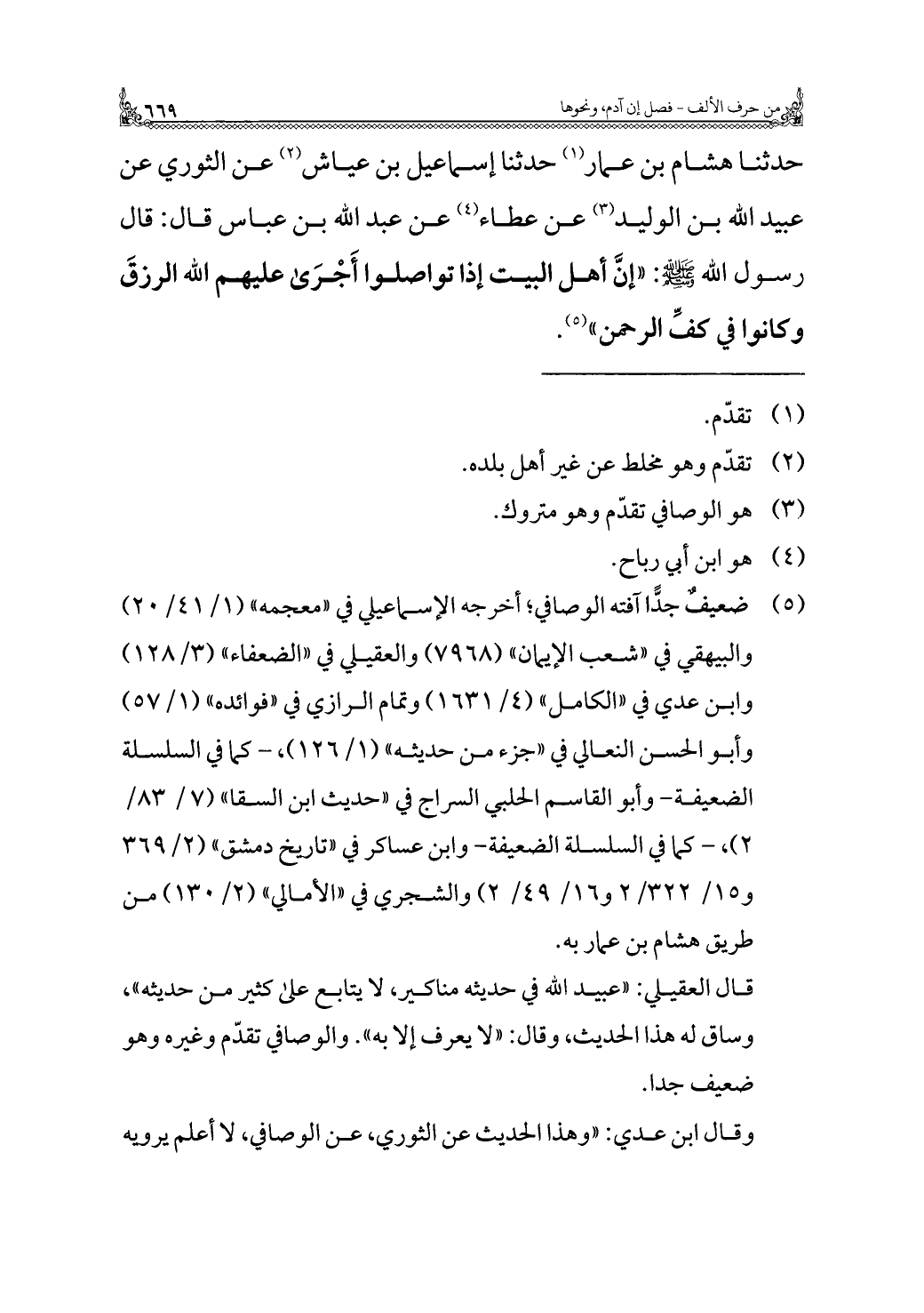 (¬٥) ضعيفٌ جدًّا آفته الوصافي؛ أخرجه الإسماعيلي في "معجمه" (١/ ٤١/ ٢٠) والبيهقي في "شعب الإيمان" (٧٩٦٨) والعقيلي في "الضعفاء" (٣/ ١٢٨) وابن عدي في "الكامل" (٤/ ١٦٣١) وتمام الرازي في "فوائده" (١/ ٥٧) وأبو الحسن النعالي في "جزء من حديثه" (١/ ١٢٦)، - كما في السلسلة الضعيفة - وأبو القاسم الحلبي السراج في "حديث ابن السقا" (٧/ ٨٣/ ٢)، - كما في السلسلة الضعيفة - وابن عساكر في "تاريخ دمشق" (٢/ ٣٦٩ و ١٥/ ٣٢٢/ ٢ و ١٦/ ٢٩/ ٢) والشجري في "الأمالي" (٢/ ١٣٠) من طريق هشام بن عمار به.